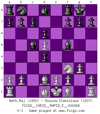 Last move : 0-1 2012 January 9 17:46:29 [Event "FICGS__CHESS__RAPID_E__000068"] [Site "FICGS"] [Date "2011.11.27"] [Round "1"] [White "Nath,Raj"] [Black "Dsouza,Stanislaus"] [Result "0-1"] [WhiteElo "1300"] [BlackElo "1207"] 1.c4 e5 2.Nc3 Nf6 3.d4 exd4 4.Nd5 Nxd5 5.cxd5 Bc5 6.Nf3 d6 7.Bd2 Bf5 8.g3 O-O 0-1 This chess game has been lost on time (started : 2011.11.27 19:28:36) English Opening Kingside Castling by player Black (move 8) Player Black won this chess game. Follow this game move after move (download)Chess is the art which expresses the science of logic. (Mikhail Botvinnik) Wer sich die Fähigkeit anerziehen will im Schach selbstständig zu denken, der muß alles meiden, was leblos ist: ausgeklügelte Theorien, die sich auf sehr wenige Beispiele und eine Menge Hirngespinste stützen. (Emanuel Lasker) No es tiempo de jugar al Ajedrez cuando la casa esta en llamas. (Proverbio Italiano) Aucun coup ne doit être joué sans but. (Pedro Damiano) All maxims have their antagonist maxims; proverbs should be sold in pairs, a single one being but a half truth. (William Mathews)