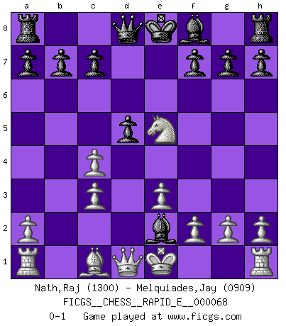 Last move : 0-1 2012 January 16 6:20:20 [Event "FICGS__CHESS__RAPID_E__000068"] [Site "FICGS"] [Date "2011.11.27"] [Round "1"] [White "Nath,Raj"] [Black "Melquiades,Jay"] [Result "0-1"] [WhiteElo "1300"] [BlackElo "0909"] 1.c4 d5 2.e3 e5 3.d4 Nf6 4.dxe5 Ne4 5.Nc3 Nxc3 6.bxc3 Nc6 7.Nf3 Bg4 8.Be2 Nxe5 9.Nxe5 Bxe2 0-1 This chess game has been lost on time (started : 2011.11.27 19:28:36) English Opening Player Black won this chess game. Follow this game move after move (download)Combinations have always been the most intriguing aspect of Chess. The masters look for them, the public applauds them, the critics praise them. It is because combinations are possible that Chess is more than a lifeless mathematical exercise. They are the poetry of the game; they are to Chess what melody is to music. They represent the triumph of mind over matter. (Reuben Fine) Sie führen leise Selbstgespräche, schlürfen lautstark ihre Getränke, schmatzen hörbar beim Essen, blasen ihrem Gegenüber Rauch in die Augen, niesen ihm ins Gesicht, starren ihn unverwandt an, bis er sich unter ihren Blicken windet, rutschen ständig auf ihrem Stuhl hin und her, rülpsen und bohren in der Nase. (Anonymous) El arma más poderosa en el Ajedrez, es tener la próxima movida. (David Bronstein) Les erreurs sont comme les malheurs, elles n'arrivent jamais seules. (Siegbert Tarrasch) I know the human being and fish can coexist peacefully. (George W. Bush, Saginaw sept. 29, 2000)