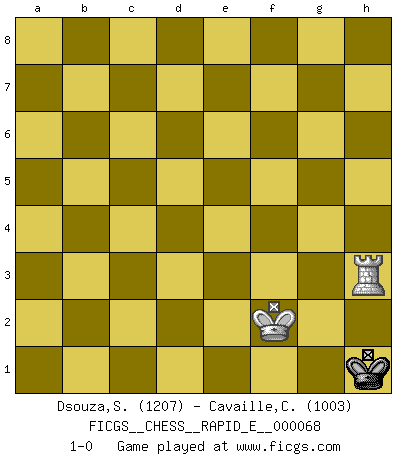 Last move : 1-0 2012 February 28 21:23:23 [Event "FICGS__CHESS__RAPID_E__000068"] [Site "FICGS"] [Date "2011.11.27"] [Round "1"] [White "Dsouza,Stanislaus"] [Black "Cavaille,Cedric"] [Result "1-0"] [WhiteElo "1207"] [BlackElo "1003"] 1.e4 c5 2.Nf3 d6 3.Bc4 Nf6 4.O-O e6 5.Bb5+ Bd7 6.Bxd7+ Qxd7 7.d3 Be7 8.e5 dxe5 9.Be3 a6 10.Nxe5 Qc7 11.f4 Bd6 12.Nc3 Nc6 13.Nxc6 Qxc6 14.d4 cxd4 15.Bxd4 O-O 16.Bxf6 gxf6 17.Qg4+ Kh8 18.Rf3 Rg8 19.Qh5 e5 20.fxe5 Bxe5 21.Rh3 Rg7 22.Rf1 Qb6+ 23.Kh1 Qxb2 24.Nd5 Qxa2 25.Ne3 b5 26.Nf5 Qxc2 27.Nxg7 Kxg7 28.Qh6+ Kh8 29.Rhf3 Qg6 30.Qd2 a5 31.Qd5 b4 32.Qxa8+ Qg8 33.Qxg8+ Kxg8 34.Rd3 a4 35.g4 b3 36.Rd7 Kg7 37.Ra7 b2 38.Rxa4 Kg6 39.Rb4 h5 40.gxh5+ Kxh5 41.Rf5+ Kg6 42.Rxe5 fxe5 43.Rxb2 f5 44.Kg2 f4 45.Kf3 Kf5 46.Rb8 e4+ 47.Kf2 f3 48.Ke3 Kg4 49.Rf8 Kh3 50.Rh8+ Kg2 51.Kxe4 f2 52.Rf8 f1Q 53.Rxf1 Kxh2 54.Rf3 Kg2 55.Ke3 Kh2 56.Kf2 Kh1 57.Rh3+ 1-0 Sicilian Kingside Castling by player White (move 4) Kingside Castling by player Black (move 15) 10 pieces endgame at move 40 : White KRRPP , Black KBPPP WHITE : King + 2 Rooks 2 Pawns BLACK : King + 1 Bishop 3 Pawns 9 pieces endgame at move 40 : White KRRP , Black KBPPP WHITE : King + 2 Rooks 1 Pawn BLACK : King + 1 Bishop 3 Pawns 8 pieces endgame at move 42 : White KRRP , Black KPPP WHITE : King + 2 Rooks 1 Pawn BLACK : King + 3 Pawns 7 pieces endgame at move 42 : White KRP , Black KPPP WHITE : King + 1 Rook 1 Pawn BLACK : King + 3 Pawns 6 pieces endgame at move 43 : White KRP , Black KPP WHITE : King + 1 Rook 1 Pawn BLACK : King + 2 Pawns 5 pieces endgame at move 51 : White KRP , Black KP WHITE : King + 1 Rook 1 Pawn BLACK : King + 1 Pawn Promotion Queen by player Black (move 52) 4 pieces endgame at move 53 : White KRP , Black K WHITE : King + 1 Rook 1 Pawn BLACK : King + 3 pieces endgame at move 53 : White KR , Black K WHITE : King + 1 Rook BLACK : King + Player White won this chess game. Follow this game move after move (download)Play the opening like a book, the middle game like a magician, and the endgame like a machine. (Spielmann) Moralische Siege zählen nicht. (Savielly Grigorievitsch Tartakower) Del Ajedrez se ha dicho que la vida no es lo suficientemente larga para él, pero eso es culpa de la vida, no del Ajedrez. (William Ewart Napier) Nous vivons dans un monde échiquéen : chaque jour qui passe est un défi à relever. (Philosophe Sasha) When you have everything, sometimes it feels like nothing. (Horatio Caine, C.S.I. Miami)