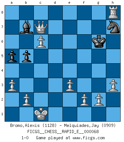 Last move : 1-0 2011 December 4 18:9:20 [Event "FICGS__CHESS__RAPID_E__000068"] [Site "FICGS"] [Date "2011.11.27"] [Round "1"] [White "Bromo,Alexis"] [Black "Melquiades,Jay"] [Result "1-0"] [WhiteElo "1128"] [BlackElo "0909"] 1.d4 d5 2.c4 dxc4 3.Nc3 c6 4.e3 e6 5.Bxc4 Nd7 6.Nf3 Bb4 7.Bd2 Ngf6 8.a3 Bxc3 9.Bxc3 Ne4 10.Qc2 b5 11.Bb3 Ndf6 12.h3 c5 13.O-O-O Bb7 14.dxc5 a5 15.Rxd8+ Kxd8 16.Bxf6+ gxf6 17.c6 Rc8 18.Rd1+ Ke8 19.Nd4 f5 20.Nxe6 fxe6 21.Bxe6 Rc7 22.Bxf5 Nf6 23.Bxh7 Nxh7 24.Qg6+ Kf8 25.Rd8+ Ke7 26.Qd6+ Kf7 27.Qxc7+ Kg6 28.Rxh8 1-0 Queen's gambit accepted Queenside Castling by player White (move 13) Player White won this chess game. Follow this game move after move (download)A sacrifice is best refuted by accepting it. (Wilhelm Steinitz) Kasparov stellt für gewöhnlich die Regeln auf und bricht sie dann selbst wieder. (Alexej Shirov) Hay jugadores fuertes y personas amables y yo soy un jugador fuerte. (Bobby Fischer) Il vaut toujours mieux jouer un plan faux de façon logique que de n'avoir pas de plan du tout. (Victor Kortchnoï) There are two major products that came out of Berkeley: LSD and UNIX. We do not believe this is to be a coincidence. (Jeremy S. Anderson)
