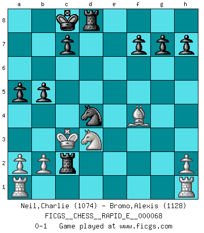 Last move : 0-1 2011 December 6 21:26:32 [Event "FICGS__CHESS__RAPID_E__000068"] [Site "FICGS"] [Date "2011.11.27"] [Round "1"] [White "Neil,Charlie"] [Black "Bromo,Alexis"] [Result "0-1"] [WhiteElo "1074"] [BlackElo "1128"] 1.e4 e5 2.Nf3 Nc6 3.d4 d5 4.exd5 Qxd5 5.dxe5 Qxd1+ 6.Kxd1 Bg4 7.Bb5 a6 8.Ba4 b5 9.Bb3 Bc5 10.Kd2 Bxf2 11.Kc3 Bxf3 12.gxf3 Nxe5 13.Bd5 O-O-O 14.Be4 Nf6 15.Bf4 Rhe8 16.Nd2 Nxe4+ 17.Nxe4 Nxf3 18.Nxf2 Re2 19.Nd3 Nd4 20.Nb4 a5 21.Nd3 Rxc2+ 0-1 Scotch Opening Queenside Castling by player Black (move 13) Player Black won this chess game. Follow this game move after move (download)That's what Chess is all about. One day you give your opponent a lesson, the next day he gives you one. (Bobby Fischer) Der Traum, für den ich lebe, ist der von einem freien Russland. Viele mögen sagen: Russland hat doch ein Parlament, einen gewählten Präsidenten. Aber ich spüre, dass in meiner Heimat die Angst wiederkehrt. Eine Angst, sich frei zu äußern, bestimmte Dinge zu tun (Garry Kasparov) En el Ajedrez, tal como en la vida, las bendiciones de hoy pueden ser el veneno del mañana. (Assaic) 'L'échange des dames est un coup dur pour les deux adversaires...' Un journaliste lors d'une partie du match Spassky-Fischer Be who you are, and say what you feel because those who mind don't matter, and those who matter don't mind. (Dr Seuss)