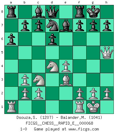 Last move : 1-0 2012 January 16 18:20:5 [Event "FICGS__CHESS__RAPID_E__000068"] [Site "FICGS"] [Date "2011.11.27"] [Round "1"] [White "Dsouza,Stanislaus"] [Black "Balander,Martin"] [Result "1-0"] [WhiteElo "1207"] [BlackElo "1041"] 1.e4 e5 2.Nf3 Nc6 3.Bc4 Nf6 4.d3 Be7 5.O-O O-O 6.Be3 d6 7.Nc3 Na5 8.Bb3 Nxb3 9.axb3 a6 10.d4 exd4 11.Nxd4 Nd7 12.Qh5 1-0 This chess game has been lost on time (started : 2011.11.27 19:28:36) Two knights defense (Modern Bishop's Opening) Kingside Castling by player White (move 5) Kingside Castling by player Black (move 5) Player White won this chess game. Follow this game move after move (download)A great player and a great example for many. His book My 60 Memorable Games had a big impact on me. It is a shame he didn't continue to enrich the world of chess with his unparalleled understanding after 1972. (Jan Timman, about Bobby Fischer's death) Ich organisiere ein großes Turnier, was mich etwa 120000 Dollar kostet. Ich denke, das ist das erste Mal in der Schachgeschichte, daß ein Schachgroßmeister auch als Mäzen auftritt. (Miguel Najdorf) El Ajedrez moderno está demasiado preocupado con cosas como la estructura de Peones. Olvidenlo, el Jaque Mate termina la partida. (Nigel Short) A chaque perte on perd un peu de soi. (Joël Lautier) Home computers are being called upon to perform many new functions, including the consumption of homework formerly eaten by the dog. (Doug Larson)