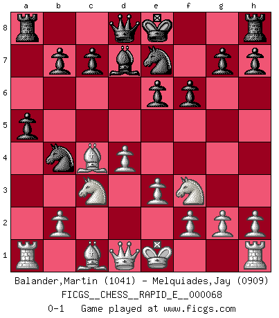 Last move : 0-1 2012 January 25 6:34:15 [Event "FICGS__CHESS__RAPID_E__000068"] [Site "FICGS"] [Date "2011.11.27"] [Round "1"] [White "Balander,Martin"] [Black "Melquiades,Jay"] [Result "0-1"] [WhiteElo "1041"] [BlackElo "0909"] 1.d4 d5 2.c4 e6 3.Nc3 Bb4 4.Nf3 f6 5.Qc2 a5 6.a3 Nc6 7.axb4 Nxb4 8.Qd1 Ne7 9.e3 dxc4 10.Bxc4 Bd7 0-1 This chess game has been lost on time (started : 2011.11.27 19:28:36) QGD : 3.Nc3 Player Black won this chess game. Follow this game move after move (download)Of Chess it has been said that life is not long enough for it, but that is the fault of life, not Chess. (William Ewart Napier) Wenn du gegen Bobby spielst, ist es keine Frage von gewinnen oder verlieren. Es ist eine Frage des Überlebens. (Boris Vassilievich Spassky) Yo adoro todas la posiciones. Denme una partida posicional difícil, y la jugaré. Pero posiciones totalmente ganadas, no las tolero. (Hein Donner) Vous savez, camarade Pachman, je n'éprouve pas de plaisir à être ministre, je jouerais plutôt aux échecs comme vous, ou alors ferais une révolution au Venezuela. (Che Guevara à Ludek Pachman, 'Checkmate in Prague', 1975) To send light into the darkness of men's hearts - such is the duty of the artist. (Schumann)