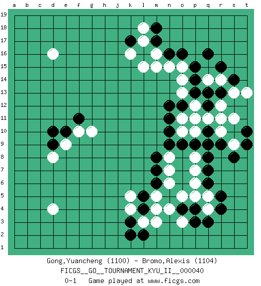 Last move : 0-1 2012 February 27 20:1:3 [Event "FICGS__GO__TOURNAMENT_KYU_II__000040"] [Site "FICGS"] [Date "2011.11.29"] [Round "1"] [Black "Gong,Yuancheng"] [White "Bromo,Alexis"] [Result "0-1"] [Rating 1 "1100"] [Rating 2 "1104"] 1.q16 d4 2.r4 d16 3.p3 p5 4.q6 q5 5.r5 p6 6.q7 p7 7.q8 p8 8.l4 q9 9.p9 p10 10.o9 o10 11.n9 n8 12.n10 o11 13.m8 n7 14.m7 n6 15.m6 m5 16.n5 n4 17.l5 o5 18.n11 m4 19.q10 q11 20.r9 r10 21.q9 s11 22.q12 p11 23.o12 p12 24.p13 r11 25.q13 s9 26.s8 r12 27.r13 s13 28.s14 t13 29.t9 r14 30.r15 q14 31.p14 o13 32.n12 o14 33.p15 o15 34.o16 n15 35.n16 m15 36.t10 m16 37.m17 l17 38.m18 l18 39.l16 k16 40.k17 l15 41.d10 e9 42.d9 d8 43.e10 f10 44.f11 g10 45.o4 o3 46.p4 q4 47.q3 l3 48.k3 k4 49.l2 m3 50.k2 k5 0-1 This go game has been lost on time (started : 2011.11.29 13:17:9) Here are the names of the openings (joseki) played in the four corners : Corner q16 : q16 o11 Hoshi (Hwajeom, Seongjeom, Xingwei`) 4-4 Point. The star or hoshi (4-4) point, emphasizing influence at the potential expense of territory. Corner d16 : d16 f11 Hoshi (Hwajeom, Seongjeom, Xingwei`) 4-4 Point. The star or hoshi (4-4) point, emphasizing influence at the potential expense of territory. Player White won this Go (weiqi, baduk) game. Follow this game move after move (download)Add one stone, then sacrifice both. (Anonymous) War is the child of passion, passion is the child of narcissism and narcissism is the child. (...) Another game ? (Thibault de Vassal)