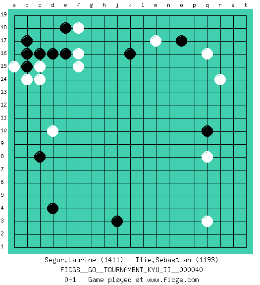 Last move : 0-1 2012 February 18 1:55:59 [Event "FICGS__GO__TOURNAMENT_KYU_II__000040 "] [Site "FICGS"] [Date "2011.11.29"] [Round "1"] [Black "Segur,Laurine "] [White "Ilie,Sebastian "] [Result "0-1"] [Rating 1 "1411"] [Rating 2 "1193"] 1.d4 q3 2.d16 q16 3.j3 d10 4.q10 q8 5.k16 c14 6.b15 c15 7.c16 b14 8.b17 a15 9.b16 f16 10.e18 f18 11.e16 f15 12.o17 r14 13.c8 m17 0-1 Here are the names of the openings (joseki) played in the four corners : Corner d16 : d16 c14Hoshi (Hwajeom, Seongjeom, Xingwei`) 4-4 Point. The star or hoshi (4-4) point, emphasizing influence at the potential expense of territory.Ikken Kakari (Hankan Keolch'im, Yi Gua`jiao~, 1-Space Low Approach). White 2 is the standard approach move to the 4-4. Corner q16 : q16 o17Hoshi (Hwajeom, Seongjeom, Xingwei`) 4-4 Point. The star or hoshi (4-4) point, emphasizing influence at the potential expense of territory.Ikken Kakari (Hankan Keolch'im, Yi Gua`jiao~, 1-Space Low Approach). Black 2 is the standard approach move to the 4-4. Player White won this Go (weiqi, baduk) game.Follow this game move after move (download ) The poor player plays the opponent's game for him. (Anonymous) You have to believe in yourself. (Sun Tzu)