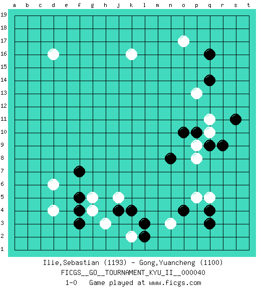 Last move : 1-0 2012 February 21 19:50:8 [Event "FICGS__GO__TOURNAMENT_KYU_II__000040"] [Site "FICGS"] [Date "2011.11.29"] [Round "1"] [Black "Ilie,Sebastian"] [White "Gong,Yuancheng"] [Result "1-0"] [Rating 1 "1193"] [Rating 2 "1100"] 1.q16 d4 2.q3 d16 3.r9 o17 4.q14 k16 5.f3 h3 6.f5 d6 7.j4 k2 8.l3 n3 9.l2 g4 10.f4 g5 11.f7 j5 12.k4 q5 13.q4 p5 14.o4 q10 15.q9 p9 16.p10 q11 17.o10 p8 18.s11 p13 19.n8 1-0 This go game has been lost on time (started : 2011.11.29 13:17:9) Here are the names of the openings (joseki) played in the four corners : Corner q16 : q16 o17 Hoshi (Hwajeom, Seongjeom, Xingwei`) 4-4 Point. The star or hoshi (4-4) point, emphasizing influence at the potential expense of territory. Ikken Kakari (Hankan Keolch'im, Yi Gua`jiao~, 1-Space Low Approach). White 2 is the standard approach move to the 4-4. Corner d4 : d4 f3 Hoshi (Hwajeom, Seongjeom, Xingwei`) 4-4 Point. The star or hoshi (4-4) point, emphasizing influence at the potential expense of territory. Ikken Kakari (Hankan Keolch'im, Yi Gua`jiao~, 1-Space Low Approach). Black 2 is the standard approach move to the 4-4. Player Black won this Go (weiqi, baduk) game. Follow this game move after move (download)Use a wall to attack, not to make territory. (Anonymous) Macintosh - we might not get everything right, but at least we knew the century was going to end. (Douglas Adams)