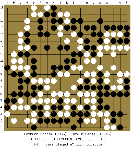 Last move : 1-0 2011 December 30 21:44:51 [Event "FICGS__GO__TOURNAMENT_KYU_II__000040"] [Site "FICGS"] [Date "2011.11.29"] [Round "1"] [Black "Lamburn,Graham"] [White "Uzdin,Sergey"] [Result "1-0"] [Rating 1 "2066"] [Rating 2 "1746"] 1.q16 c4 2.q4 e3 3.c9 d16 4.f17 c13 5.c6 k4 6.k16 o4 7.q6 q3 8.r3 p3 9.r2 r10 10.r14 s7 11.s6 r7 12.r6 r12 13.p17 d17 14.f15 k17 15.j17 j16 16.h17 j15 17.l17 k18 18.l16 c11 19.h3 j3 20.h4 f6 21.l3 k6 22.j2 o6 23.q7 q8 24.p8 q9 25.o7 m6 26.g2 e2 27.t7 s8 28.e9 m8 29.n7 n6 30.m7 l7 31.j13 k9 32.g13 k14 33.d14 c14 34.l12 m14 35.n13 m16 36.m17 l15 37.n16 n15 38.o16 o14 39.o13 q14 40.p14 p13 41.p15 m13 42.m12 n12 43.o12 n11 44.k13 q13 45.n14 o11 46.o15 p12 47.m15 r15 48.r16 s15 49.s16 n2 50.m2 f18 51.g18 e18 52.l4 l5 53.j4 k3 54.k2 k5 55.n3 o2 56.t8 t9 57.t6 s9 58.s14 q15 59.t15 g16 60.f16 b10 61.e11 d10 62.e10 d9 63.d8 e8 64.e7 f8 65.f7 d7 66.c8 g7 67.e6 g8 68.d6 f5 69.b9 h6 70.b5 b4 71.d15 c15 72.d12 d13 73.e13 c10 74.c7 s13 75.a4 a3 76.a5 b2 77.c12 b12 78.h10 m4 79.m3 q2 80.l1 o9 81.k10 l10 82.k11 j9 83.h9 h8 84.n4 c5 85.b6 g3 86.f3 g4 87.f4 g5 88.e4 d4 89.f2 n5 90.p5 o5 91.p9 p10 92.e1 d2 93.l11 m10 94.a10 b11 95.j10 e5 96.n8 n9 97.j5 r1 98.s1 q1 99.s3 o8 100.p7 r13 101.t14 j6 102.p4 h5 103.h2 t13 104.t16 o3 105.p6 g19 106.h19 g17 107.f19 j18 108.h16 e19 109.g15 g19 110.h18 1-0 Here are the names of the openings (joseki) played in the four corners : Corner d16 : d16 f17 Hoshi (Hwajeom, Seongjeom, Xingwei`) 4-4 Point. The star or hoshi (4-4) point, emphasizing influence at the potential expense of territory. Ikken Kakari (Hankan Keolch'im, Yi Gua`jiao~, 1-Space Low Approach). Black 2 is the standard approach move to the 4-4. Corner q4 : q4 o4 Hoshi (Hwajeom, Seongjeom, Xingwei`) 4-4 Point. The star or hoshi (4-4) point, emphasizing influence at the potential expense of territory. Ikken Takagakari (Hankan Nop'dakeolch'im, Yi Gaojia, 1-Space High Approach). Black typically responds at 6-4 or 3-10. Black 4-10 is played when Black finds play on the right side advantageous. Black 4-8 or 3-8 may be played when Black has support at top. Player Black won this Go (weiqi, baduk) game. Follow this game move after move (download)More haste less speed. (John Fairbairn) Don't be discouraged. It's often the last key in the bunch that opens the lock. (Author unknown)