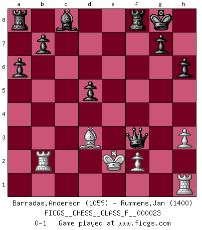 Last move : 0-1 2007 January 26 0:20:54 [Event "FICGS__CHESS__CLASS_F__000023"] [Site "FICGS"] [Date "2007.01.08"] [Round "1"] [White "Barradas,Anderson"] [Black "Rummens,Jan"] [Result "0-1"] [WhiteElo "1059"] [BlackElo "1400"] 1.d4 Nf6 2.c4 c5 3.Nc3 cxd4 4.Qxd4 Nc6 5.Qd1 e6 6.e4 Bb4 7.Bg5 h6 8.Bxf6 Qxf6 9.Nge2 Ne5 10.h3 Bc5 11.Nd4 Bxd4 12.Qxd4 Nf3+ 13.gxf3 Qxd4 14.Rd1 Qc5 15.Na4 Qb4+ 16.Nc3 Qxb2 17.Nb5 O-O 18.Bd3 a6 19.Rb1 Qe5 20.Na3 Qc3+ 21.Ke2 Qxa3 22.Rhd1 Qxa2+ 23.Rd2 Qa5 24.R1b2 Qh5 25.Rd1 f5 26.Rh1 fxe4 27.Bxe4 d5 28.cxd5 exd5 29.Bd3 Qxf3+ 0-1 Benoni defense Kingside Castling by player Black (move 17) Player Black won this chess game. Follow this game move after move (download)If one piece is badly posted, the whole game is bad. (Tarrasch) Frage: Wie viele Autos haben Sie schon zerstört? - Antwort: Nur zwei. (Loek van Wely) Repentinamente, me resultaba obvio en mi analisis que yo había pasado por alto lo que Fischer había visto en el tablero con la mas grande facilidad. (Mikhail Botvinnik) Un journaliste : 'Vous préférez avoir une dame de plus sur l'échiquier ou au lit ?' Boris Spassky : 'Ca dépend de la position.' Animated gif is worth one mega-word. (Unknown)