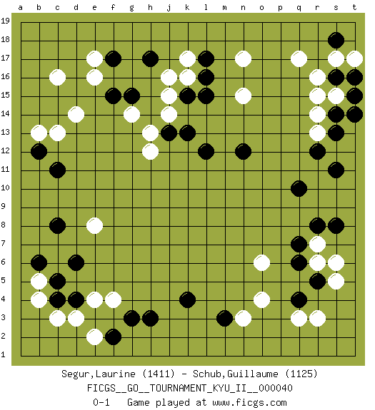 Last move : 0-1 2012 April 3 0:27:37 [Event "FICGS__GO__TOURNAMENT_KYU_II__000040"] [Site "FICGS"] [Date "2011.11.29"] [Round "1"] [Black "Segur,Laurine"] [White "Schub,Guillaume"] [Result "0-1"] [Rating 1 "1411"] [Rating 2 "1125"] 1.d4 q17 2.q4 c16 3.r8 e17 4.c8 r15 5.k4 e8 6.c11 f4 7.r12 c3 8.h3 d3 9.b6 o4 10.m3 n3 11.f2 b5 12.c4 b4 13.c5 e4 14.d6 e2 15.g3 r3 16.q6 q3 17.h17 c13 18.s14 n17 19.l17 n15 20.q10 r7 21.q7 r6 22.r5 s5 23.s8 s6 24.s16 s15 25.t15 r16 26.s18 s17 27.t16 t17 28.t14 r14 29.s13 r13 30.s11 k16 31.l16 k17 32.l15 j15 33.k15 j16 34.k13 j14 35.l12 h12 36.j13 h13 37.n12 o6 38.b12 b13 39.f17 e16 40.g15 g14 41.f15 d14 0-1 Here are the names of the openings (joseki) played in the four corners : Player White won this Go (weiqi, baduk) game. Follow this game move after move (download)There is no territory in the centre. (Anonymous) It is a good thing for an uneducated man to read books of quotations. (Winston Churchill)