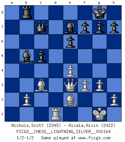 Last move : 1/2-1/2 2011 November 29 17:4:30 [Event "FICGS__CHESS__LIGHTNING_SILVER__000164"] [Site "FICGS"] [Date "2011.11.29"] [Round "1"] [White "Nichols,Scott"] [Black "Alcala,Alvin"] [Result "1/2-1/2"] [WhiteElo "2345"] [BlackElo "2422"] 1.d4 Nf6 2.c4 c6 3.Nf3 d5 4.e3 e6 5.Nc3 Nbd7 6.Bd3 dxc4 7.Bxc4 b5 8.Be2 b4 9.Na4 Be7 10.O-O O-O 11.Qc2 Bb7 12.a3 a5 13.Rd1 Qc8 14.Nc5 Nxc5 15.dxc5 Nd7 16.axb4 axb4 17.Rxa8 Bxa8 18.Bd2 Bxc5 19.Ne5 Bd6 20.Nxd7 Qxd7 21.Bxb4 c5 22.Bc3 Qc7 23.g3 Rb8 24.Qd3 Be7 25.f3 Bc6 26.e4 Bb5 27.Qe3 1/2-1/2 Queen's pawn game Kingside Castling by player White (move 10) Kingside Castling by player Black (move 10) This chess game ended in a draw. Follow this game move after move (download)Chess is a terrific way for kids to build self image and self esteem. (Saudin Robovic) Ohne Leiden bildet sich kein Charakter. (Ernst Freiherr von Feuchtersleben) Realmente no sabemos como el juego fue inventado, aunque hay sospechas. Tan pronto como descubramos a los culpables, se los haremos saber. (Bruce Pandolfini) Des points faibles ou des trous dans la position de l'adversaire doivent être occupés par des pièces et non pas par des pions. (Siegbert Tarrasch) They say in chess you've got to kill the queen, and then you mate it... Oh I, do you ? (Red Hot Chili Peppers, Fortune faded)