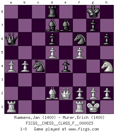 Last move : 1-0 2007 May 6 1:57:52 [Event "FICGS__CHESS__CLASS_F__000023"] [Site "FICGS"] [Date "2007.01.08"] [Round "1"] [White "Rummens,Jan"] [Black "Murer,Erich"] [Result "1-0"] [WhiteElo "1400"] [BlackElo "1400"] 1.e4 e5 2.Nf3 Nc6 3.Bb5 a6 4.Ba4 Nf6 5.O-O Be7 6.Re1 b5 7.Bb3 d6 8.c3 O-O 9.d3 Na5 10.Bc2 c5 11.Bg5 h6 12.Bc1 Be6 13.d4 cxd4 14.cxd4 Qc7 15.Nc3 Rac8 16.Bd3 Rfd8 17.d5 Bd7 18.a4 b4 19.Na2 Qb6 20.Be3 Qb7 21.b3 Ng4 22.Bd2 Qb6 23.Rf1 f5 24.exf5 Nf6 25.Nxb4 e4 26.Bxa6 Ra8 27.Nh4 Rxa6 28.Nxa6 Qxa6 29.b4 Nc4 30.Qe2 1-0 Ruy Lopez : Closed Kingside Castling by player White (move 5) Kingside Castling by player Black (move 8) Player White won this chess game. Follow this game move after move (download)With or without the title, Bobby Fischer was unquestionably the greatest player of his time. (Burt Hochberg) Schach ist eine Sache der genauen Beurteilung, wann man zuschlagen und wann man sich ducken muss. (Robert James Fischer) ¿Esta Bobby Fischer algo cuerdo?. (Salo Flohr) Karpov est une pièce de musée. (Garry Kasparov) The Movers & Shakers of this world are those who play chess in the mornings and go to the disco in the evenings. (Dinesh De Silva)