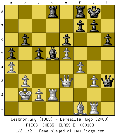 Last move : 1/2-1/2 2012 April 19 22:31:32 [Event "FICGS__CHESS__CLASS_B__000163"] [Site "FICGS"] [Date "2011.11.29"] [Round "1"] [White "Cesbron,Guy"] [Black "Bersaille,Hugo"] [Result "1/2-1/2"] [WhiteElo "1989"] [BlackElo "2000"] 1.e4 e6 2.b3 d5 3.Bb2 dxe4 4.Nc3 Nf6 5.Qe2 Be7 6.O-O-O a5 7.a4 b6 8.Nxe4 Bb7 9.Nxf6+ Bxf6 10.Nf3 O-O 11.Qe3 Nc6 12.Bc4 Bxb2+ 13.Kxb2 Qf6+ 14.d4 Rad8 15.Ne5 Nxe5 16.dxe5 Qh4 17.g3 Qh3 18.Qg5 Rde8 19.Rhf1 h6 20.Qe3 Rd8 21.f4 Qxh2 22.Bd3 Qh3 23.Rd2 c5 24.Rg1 Bd5 25.Bf1 1/2-1/2 French : Reti (Spielmann) variation Queenside Castling by player White (move 6) Kingside Castling by player Black (move 10) This chess game ended in a draw. Follow this game move after move (download)If I win a tournament, I win it by myself. I do the playing. Nobody helps me. (Bobby Fischer) Schach ist mein Leben, meine Leidenschaft, was ich gelernt habe und seit meinem 14. Lebensjahr profimässig praktiziere. Darauf zu verzichten, würde mir sehr schwer fallen. (Viktor Kortschnoi) Me dio la sensación de como si yo estuviera jugando en contra del mismo Ajedrez. - al estar jugando en contra de Robert Fischer (Walter Shipman) Je crois qu'il existe des manières très spécifiques de jouer efficacement contre une machine. Evidemment, nous n'avons aucune chance en technique pure, parce que l'ordinateur calcule de manière parfaite. Mais lorsque nous faisons appel à notre cerveau, en utilisant l'intuition et la compréhension, alors nous restons beaucoup plus forts. (Anatoli Karpov) Success without honor is an unseasoned dish; it will satisfy your hunger, but it won't taste good. (Joe Paterno)