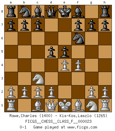 Last move : 0-1 2007 February 18 23:6:12 [Event "FICGS__CHESS__CLASS_F__000023"] [Site "FICGS"] [Date "2007.01.08"] [Round "1"] [White "Rowe,Charles"] [Black "Kis-Kos,Laszlo"] [Result "0-1"] [WhiteElo "1400"] [BlackElo "1265"] 1.e4 e5 2.Nc3 Nf6 3.f4 d5 0-1 This chess game has been lost on time (started : 2007.01.08 16:49:7) Vienna gambit Player Black won this chess game. Follow this game move after move (download)Chess is a forcing house where the fruits of character can ripen more fully than in life. (Edward Morgan Foster) Wenn Du absolut nicht mehr weißt, was Du tun sollst, dann ist es Zeit für Panik. (John van der Wiel) La pasion por jugar al Ajedrez es una de las mas inexplicables en el mundo. (H.G. Wells) Il n'y a pas de prix trop élevé au scalp de l'ennemi. (Koblentz) When I took office, only high energy physicists had ever heard of what is called the World Wide Web... Now even my cat has its own page. (Bill Clinton, 1996)