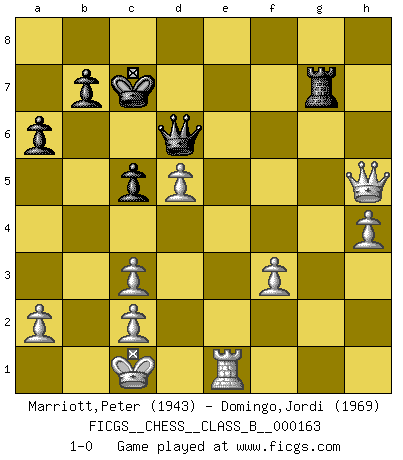 Last move : 1-0 2012 September 26 8:27:22 [Event "FICGS__CHESS__CLASS_B__000163"] [Site "FICGS"] [Date "2011.11.29"] [Round "1"] [White "Marriott,Peter"] [Black "Domingo,Jordi"] [Result "1-0"] [WhiteElo "1943"] [BlackElo "1969"] 1.e4 h6 2.d4 c5 3.d5 d6 4.Nc3 g5 5.h4 g4 6.Bb5+ Nd7 7.Qxg4 Ngf6 8.Qe2 a6 9.Bxd7+ Bxd7 10.Nf3 Rg8 11.e5 dxe5 12.Nxe5 Ng4 13.Nxd7 Qxd7 14.Bf4 Bg7 15.O-O-O Bxc3 16.bxc3 O-O-O 17.g3 h5 18.f3 Nf6 19.Rhe1 Ne8 20.Qxe7 Nd6 21.Bxd6 Qxd6 22.Qxf7 Rxg3 23.Re8 Rxe8 24.Qxe8+ Kc7 25.Re1 Rg7 26.Qxh5 1-0 This chess game has been lost on time (started : 2011.11.29 16:28:40) Carr's defense Queenside Castling by player White (move 15) Queenside Castling by player Black (move 16) Player White won this chess game. Follow this game move after move (download)I'd rather have a Pawn than a finger. (Reuben Fine) Das Schach ist nichts für kleine Geister, es beansprucht einen vollen Mann, der sich nicht sklavisch an das Überlieferte hält, sondern selbständig die Tiefen des Spiels zu ergründen sucht. (Wilhelm Steinitz) Yo siempre he tenido un ligero sentimiento de lástima por una persona que no tiene conocimiento del Ajedrez. (Siegbert Tarrasch) Les échecs sont utiles à l'exercice de la faculté de penser et à celle de l'imagination. Car nous devons posséder une méthode élaborée pour atteindre des buts partout où nous devons conduire notre raison. (Leibnitz) Before all elsed, be armed. (Niccolo Machiavelli)