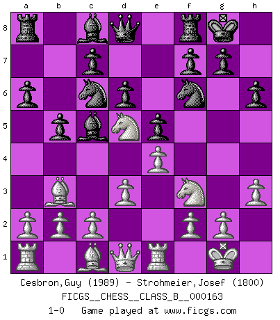 Last move : 1-0 2012 February 5 17:57:13 [Event "FICGS__CHESS__CLASS_B__000163"] [Site "FICGS"] [Date "2011.11.29"] [Round "1"] [White "Cesbron,Guy"] [Black "Strohmeier,Josef"] [Result "1-0"] [WhiteElo "1989"] [BlackElo "1800"] 1.e4 e5 2.Nf3 Nc6 3.Bb5 a6 4.Ba4 Nf6 5.O-O Be7 6.Re1 b5 7.Bb3 O-O 8.h3 Bc5 9.d3 h6 10.Nc3 d6 11.Nd5 1-0 Ruy Lopez : Closed, 7...O-O Kingside Castling by player White (move 5) Kingside Castling by player Black (move 7) Player White won this chess game. Follow this game move after move (download)What would Chess be without silly mistakes ? (Kurt Richter) Die jungen Leute sollen verstehen, dass sie noch etwas von mir lernen können und müssen. (Viktor Kortschnoi) El jugador de combinación piensa hacia adelante; comienza de la posición dada y trabaja las movidas contundentes en su mente. (Emanuel Lasker) Tout change constamment, y compris dans le monde des Echecs. (Botvinnik) Strategy without tactics is the slowest route to victory. Tactics without strategy is the noise before defeat. (Sun Tzu)