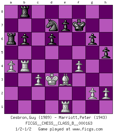 Last move : 1/2-1/2 2012 May 24 13:40:38 [Event "FICGS__CHESS__CLASS_B__000163"] [Site "FICGS"] [Date "2011.11.29"] [Round "1"] [White "Cesbron,Guy"] [Black "Marriott,Peter"] [Result "1/2-1/2"] [WhiteElo "1989"] [BlackElo "1943"] 1.e4 d6 2.d4 Nf6 3.Nc3 g6 4.f4 Bg7 5.Nf3 c5 6.Bb5+ Bd7 7.e5 Ng4 8.e6 fxe6 9.Ng5 Bxb5 10.Nxb5 Qa5+ 11.c3 Qxb5 12.Nxe6 Qc4 13.Qxg4 cxd4 14.Nxg7+ Kf7 15.Nf5 h5 16.Ne3 dxe3 17.Qe2 Qxe2+ 18.Kxe2 a5 19.a4 Nd7 20.Bxe3 Rab8 21.b4 Rhc8 22.Kd3 Rc6 23.Rab1 Ra6 24.Rhe1 axb4 25.Rxb4 b6 1/2-1/2 Pirc : Austrian attack, Dragon formation This chess game ended in a draw. Follow this game move after move (download)Capture of the adverse King is the ultimate but not the first object of the game. (William Steinitz) Schach ist Krieg, im Schach geht es um testosterongesteuerte Urschreie. (Garry Kasparov) La vida es como un juego de Ajedrez, cambiando con cada movimiento. (Proverbio Chino) Les Echecs sont affaire de jugement sensible. Savoir quand frapper et quand esquiver. (Fischer) If only people were all showed a certain minimum level of niceness; if only people didn't retract verbal draw offers (without draw box ticked) on ficgs; if only people didn't kill; if only people didn't run concentration / extermination camps, if only people didn't drop nuclear bombs on Hiroshima and Nagasaki, and so on - it would be a much more beautiful world. But sadly, things are not so... (Normajean Yates)
