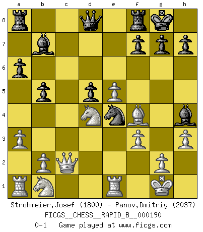 Last move : 0-1 2012 February 5 17:56:12 [Event "FICGS__CHESS__RAPID_B__000190"] [Site "FICGS"] [Date "2011.12.01"] [Round "1"] [White "Strohmeier,Josef"] [Black "Panov,Dmitriy"] [Result "0-1"] [WhiteElo "1800"] [BlackElo "2037"] 1.e4 e5 2.Nf3 Nc6 3.Bb5 a6 4.Ba4 Nf6 5.O-O Be7 6.Re1 d6 7.h3 O-O 8.c3 b5 9.Bc2 Bb7 10.d4 exd4 11.cxd4 Nb4 12.a3 Nxc2 13.Qxc2 c5 14.Bf4 cxd4 15.Nxd4 d5 16.e5 Ne4 17.f3 Bh4 0-1 Ruy Lopez : Closed, Averbach variation Kingside Castling by player White (move 5) Kingside Castling by player Black (move 7) Player Black won this chess game. Follow this game move after move (download)The game of Chess is not merely an idle amusement; several very valuable qualities of the mind are to be acquired and strengthened by it, so as to become habits ready on all occasions; for life is a kind of Chess. (Benjamin Franklin) Ich habe Kasparov in Rente geschickt. (Veselin Topalov) Todo se encuentra en un estado de flujo y esto incluye al mundo del Ajedrez. (Mikhail Botvinnik) Je ne crois pas en la psychologie, je crois aux bons coups. (Robert Fischer) Life doesn't imitate art, it imitates bad television. (Woody Allen)