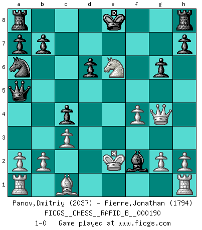 Last move : 1-0 2012 February 9 7:17:18 [Event "FICGS__CHESS__RAPID_B__000190"] [Site "FICGS"] [Date "2011.12.01"] [Round "1"] [White "Panov,Dmitriy"] [Black "Pierre,Jonathan"] [Result "1-0"] [WhiteElo "2037"] [BlackElo "1794"] 1.e4 d6 2.d4 Nf6 3.Nc3 g6 4.f4 Bg7 5.Nf3 c5 6.Bb5+ Bd7 7.e5 Ng4 8.e6 fxe6 9.Ng5 Bxb5 10.Nxe6 Bxd4 11.Nxb5 Qa5+ 12.c3 Bf2+ 13.Kd2 Na6 14.Nxd6+ exd6 15.Qxg4 c4 16.Ke2 1-0 This chess game has been lost on time (started : 2011.12.01 2:31:32) Pirc : Austrian attack, Dragon formation Player White won this chess game. Follow this game move after move (download)Tactics flow from a superior position. (Bobby Fischer) Über die Verhaftung Bobby Fischers: Warum es die Bush-Administration für nötig befindet einen 61 Jahre alten Mann zu hetzten, der für niemanden ausser sich selbste eine Gefahr darstellt ist ein Rätsel. (Nigel Short) La esencia del Ajedrez es pensar acerca de lo que el Ajedrez es. (David Bronstein) Botvinnik disait en comparant les échecs à la musique: Il existe une science dont le but est l'étude de l'acoustique et des sons. Mais il y a aussi un art qui se sert de l'océan des sons : c'est la musique. De toute évidence, il en est de même pour la pensée. La logique est l'étude des lois de la réflexion et les échecs reflètent, en tant qu'art, le côté logique de la réflexion, sous la forme d'images artistiques... Extrait de Fischer - Spassky, Reykjavik 1972 par Alexander & F. Wyndham (Ed. Solar), p 37. A good aphorism is too hard for the tooth of time, and is not worn away with the centuries, although it serves as food for every speech. (Friedrich Nietzsche)