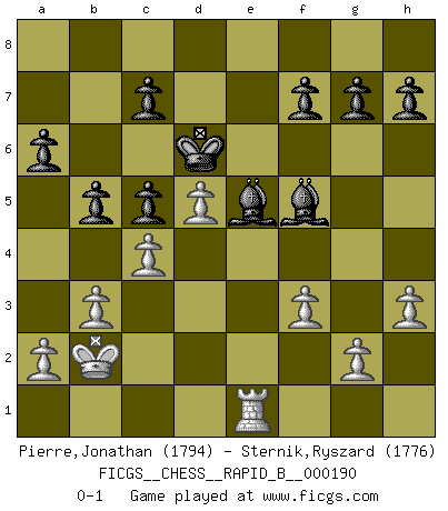 Last move : 0-1 2012 February 15 21:36:34 [Event "FICGS__CHESS__RAPID_B__000190"] [Site "FICGS"] [Date "2011.12.01"] [Round "1"] [White "Pierre,Jonathan"] [Black "Sternik,Ryszard"] [Result "0-1"] [WhiteElo "1794"] [BlackElo "1776"] 1.e4 e5 2.Nf3 Nc6 3.Bb5 a6 4.Bxc6 dxc6 5.d4 exd4 6.Qxd4 Qxd4 7.Nxd4 Bd7 8.Nc3 Bb4 9.Bd2 O-O-O 10.O-O-O Ne7 11.Nde2 Ng6 12.h3 Ne5 13.Nb1 Bd6 14.b3 Rhe8 15.Kb2 c5 16.Nbc3 Ng6 17.f3 b5 18.Nd5 Be6 19.Nef4 Be5+ 20.Kc1 Nxf4 21.Bxf4 Rxd5 22.exd5 Bxf4+ 23.Kb1 Bf5 24.Rhe1 Rxe1 25.Rxe1 Kd7 26.Kb2 Kd6 27.c4 Be5+ 0-1 Ruy Lopez : Exchange variation Queenside Castling by player Black (move 9) Queenside Castling by player White (move 10) Player Black won this chess game. Follow this game move after move (download)A man that will take back a move at Chess will pick a pocket. (Richard Fenton) Man braucht nicht immer den besten Zug zu spielen: Ein Zug muß aktiv, unternehmungslustig, korrekt und schön sein. (David Bronstein) Una partida de Ajedrez se divide en 3 etapas: la primera cuando piensas que tienes la ventaja, la segunda cuando crees que tienes la ventaja y la tercera... ¡cuando te das cuenta que vas a perder!. (Savielly Tartakower) Le succès, c'est être capable d'aller d'échec en échec sans perdre son enthousiasme. (Winston Churchill) Wikichess, chess moves explained by 'experimented' players. (Thibault de Vassal)