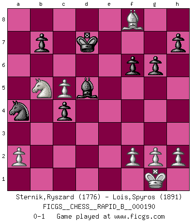 Last move : 0-1 2012 January 13 12:13:4 [Event "FICGS__CHESS__RAPID_B__000190"] [Site "FICGS"] [Date "2011.12.01"] [Round "1"] [White "Sternik,Ryszard"] [Black "Lois,Spyros"] [Result "0-1"] [WhiteElo "1776"] [BlackElo "1891"] 1.e4 e5 2.Nf3 Nc6 3.d4 exd4 4.Bc4 Bc5 5.c3 Nf6 6.O-O Nxe4 7.cxd4 d5 8.dxc5 dxc4 9.Qxd8+ Kxd8 10.Rd1+ Bd7 11.Be3 Ke7 12.Nbd2 Nxd2 13.Rxd2 Be6 14.Re1 Rhe8 15.Bf4 Rad8 16.Bxc7 Rxd2 17.Nxd2 Kd7 18.Bd6 Nb4 19.Nf3 f6 20.Nd4 Nd3 21.Re2 Bd5 22.Rxe8 Kxe8 23.Nb5 Kd7 24.Bf8 g6 25.Nxa7 Nxb2 26.Nb5 Na4 0-1 Scotch gambit Kingside Castling by player White (move 6) Player Black won this chess game. Follow this game move after move (download)The stomach is an essential part of the Chess master. (Bent Larsen) Wenn Du absolut nicht mehr weißt, was Du tun sollst, dann ist es Zeit für Panik. (John van der Wiel) Siempre es mucho mejor sacrificar las piezas de tu oponente. (Savielly Tartakover) C'est une question de caractère, Beaucoup de gens perdent leur motivation très vite. D'autres, ils sont rares, peuvent la conserver très longtemps. J'aime les échecs, encore aujourd'hui je suis heureux d'analyser des parties. J'aime toujours gagner, je déteste encore perdre. Bien jouer est important pour mon intégrité intellectuelle et morale. Et puis les échecs vivent en ce moment une période historique grâce à Internet. Ils se développent dans les systèmes éducatifs à travers le monde. Ils sortent de leur ghetto, et c'est mon rôle de mener à bien cette révolution. (Gary Kasparov) You can't play chess if you're groggy from pills. (Anatoly Karpov)