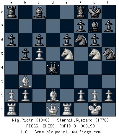 Last move : 1-0 2012 January 3 22:7:58 [Event "FICGS__CHESS__RAPID_B__000190"] [Site "FICGS"] [Date "2011.12.01"] [Round "1"] [White "Nig,Piotr"] [Black "Sternik,Ryszard"] [Result "1-0"] [WhiteElo "1800"] [BlackElo "1776"] 1.d4 d5 2.c4 c6 3.Nc3 Nf6 4.Nf3 a6 5.c5 Nbd7 6.Bf4 Nh5 7.Bd2 g6 8.e4 dxe4 9.Nxe4 Bg7 10.Bc4 O-O 11.O-O b5 12.Bb3 Ndf6 13.Neg5 e6 14.Ne5 Qxd4 15.Re1 1-0 QGD Slav defense Kingside Castling by player Black (move 10) Kingside Castling by player White (move 11) Player White won this chess game. Follow this game move after move (download)Chess is life. (Bobby Fischer) Wenn Schach ein enormer Dschungel ist, der seine Myriaden von Geheimnissen nicht preisgeben will, dann sind Computer die Kettensägen einer gewaltigen ökologisch unsensiblen Nutzholzfirma. (Nigel Short) El Ajedrez era la lengua materna de Capablanca. (Reti) Shah mat. Le roi est mort. Cri de fierté d'un joueur venant de terrasser son adversaire, courtoisement, sans effusion de sang. The Internet isn't free. It just has an economy that makes no sense to capitalism. (Brad Shapcott)