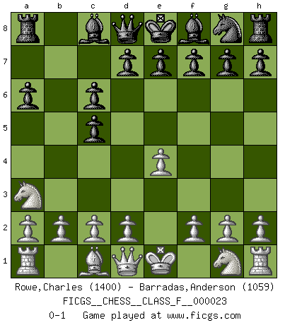 Last move : 0-1 2007 February 19 23:9:18 [Event "FICGS__CHESS__CLASS_F__000023"] [Site "FICGS"] [Date "2007.01.08"] [Round "1"] [White "Rowe,Charles"] [Black "Barradas,Anderson"] [Result "0-1"] [WhiteElo "1400"] [BlackElo "1059"] 1.e4 c5 2.Na3 Nc6 3.Bb5 a6 4.Bxc6 bxc6 0-1 This chess game has been lost on time (started : 2007.01.08 16:49:7) Sicilian defense Player Black won this chess game. Follow this game move after move (download)Bobby Fischer is the greatest Chess player who has ever lived. (Ken Smith) Das Schachspiel hat wie die Liebe, die Musik, die Fähigkeit, den Menschen glücklich zu machen. Ich habe ein leises Gefühl des Bedauerns für jeden, der das Schachspiel nicht kennt, so wie ich jeden bedaure, der die Liebe nicht kennt. (Siegbert Tarrasch) Coloca el contenido del tablero de Ajedrez en un sombrero, agita las piezas vigorosamente, derrámalas en el tablero desde una altura de medio metro y así obtienes el estilo de Wilhelm Steinitz. (H. E. Bird) Les Echecs ont trois composantes : le temps, l'espace et le matériel en dernier. (Mikhail Tal) Always two there are. No more no less. A master, and an apprentice. (Master Yoda in Star Wars ep.1)