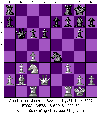 Last move : 0-1 2012 January 19 15:29:23 [Event "FICGS__CHESS__RAPID_B__000190"] [Site "FICGS"] [Date "2011.12.01"] [Round "1"] [White "Strohmeier,Josef"] [Black "Nig,Piotr"] [Result "0-1"] [WhiteElo "1800"] [BlackElo "1800"] 1.e4 c5 2.Nf3 d6 3.Bb5+ Bd7 4.Bxd7+ Nxd7 5.O-O Ngf6 6.d3 g6 7.b3 Bg7 8.Bb2 O-O 9.c4 Nb8 10.Nc3 Nfd7 11.d4 cxd4 12.Nxd4 Nc5 13.Qd2 Nc6 14.Nxc6 bxc6 15.f3 Qb6 16.Rac1 Nxe4 0-1 Sicilian : Canal-Sokolsky attack, 3...Bd7 Kingside Castling by player White (move 5) Kingside Castling by player Black (move 8) Player Black won this chess game. Follow this game move after move (download)The passion for playing Chess is one of the most unaccountable in the world. (H.G. Wells) Mein erstes Ziel war nicht, die Partie zu gewinnen, sondern eine Figur zu opfern. -- der junge (Wilhelm Steinitz) El juego del Ajedrez no es solamente una diversión quieta; algunas cualidades muy valuables de la mente se pueden adquirir y cultivar con el, como convertirlos en habitos disponibles para toda ocasión; ya que la vida es algo así como el Ajedrez. (Benjamin Franklin) La conception d'un plan est le processus par lequel un joueur exploite les avantages de sa position tout en s'efforçant d'en réduire au minimum les inconvénients. Afin de garantir le succès, un plan doit toujours se fonder sur un diagnostic objectif des particularités d'une position. La conception d'un plan est d'autant plus difficile que la position est équilibrée, et grandement facilitée lorsqu'il n'existe qu'un seul plan susceptible de répondre aux exigences de la position. (Harry Golombek) If I had no sense of humor, I would long ago have committed suicide. (Mahatma Gandhi)