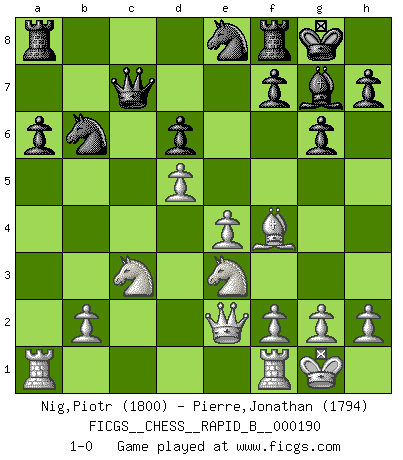 Last move : 1-0 2012 January 20 16:39:43 [Event "FICGS__CHESS__RAPID_B__000190"] [Site "FICGS"] [Date "2011.12.01"] [Round "1"] [White "Nig,Piotr"] [Black "Pierre,Jonathan"] [Result "1-0"] [WhiteElo "1800"] [BlackElo "1794"] 1.d4 Nf6 2.c4 c5 3.d5 e6 4.Nc3 exd5 5.cxd5 g6 6.Nf3 a6 7.a4 d6 8.e4 Bg4 9.Be2 Nbd7 10.O-O Bg7 11.Bf4 Qc7 12.Nd2 Bxe2 13.Qxe2 O-O 14.Nc4 Ne8 15.a5 b5 16.axb6 Nxb6 17.Ne3 c4 18.Na4 c3 19.Nxc3 1-0 Benoni defense Kingside Castling by player White (move 10) Kingside Castling by player Black (move 13) Player White won this chess game. Follow this game move after move (download)Best by test: 1. e4 (Bobby Fischer) Was ist der Unterschied zwischen einem Strassenarbeiter und einem Schachspieler? --Der Schachspieler bewegt sich ab und zu. (Anonymous) La belleza de un movimiento no se refleja solo en su apariencia, sino en el pensamiento detrás de él. (Siegbert Tarrasch) Un journaliste : 'Vous préférez avoir une dame de plus sur l'échiquier ou au lit ?' Boris Spassky : 'Ca dépend de la position.' The production of too many useful things results in too many useless people. (Karl Marx)