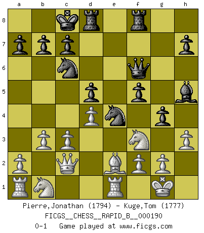 Last move : 0-1 2012 January 5 19:48:26 [Event "FICGS__CHESS__RAPID_B__000190"] [Site "FICGS"] [Date "2011.12.01"] [Round "1"] [White "Pierre,Jonathan"] [Black "Kuge,Tom"] [Result "0-1"] [WhiteElo "1794"] [BlackElo "1777"] 1.e4 e5 2.Nf3 Nf6 3.Nxe5 d6 4.Nf3 Nxe4 5.d4 d5 6.Bd3 Nc6 7.O-O Bg4 8.Re1 f5 9.c3 Qd6 10.h3 Bh5 11.b3 O-O-O 12.Ba3 Qf6 13.Bxf8 Rhxf8 14.Be2 g5 15.Qc2 g4 0-1 Petrov : Classical attack Kingside Castling by player White (move 7) Queenside Castling by player Black (move 11) Player Black won this chess game. Follow this game move after move (download)Chess, like any creative activity, can exist only through the combined efforts of those who have creative talent, and those who have the ability to organize their creative work. (Mikhail Botvinnik) Frage des Reporters: -Worin besteht das Ziel von Gambiteröffnungen? Antwort: -Auf Kosten der Partie einen Ruf als Angriffspieler zu erwerben.- (Siegbert Tarrasch) La esencia del Ajedrez es pensar acerca de lo que el Ajedrez es. (David Bronstein) Les échecs, c'est la lutte contre l'erreur. (Johannes Zukertort) Thibault, I ask for draw. Game 13876. - Sorry Ilmars, you won. (FICGS chat)