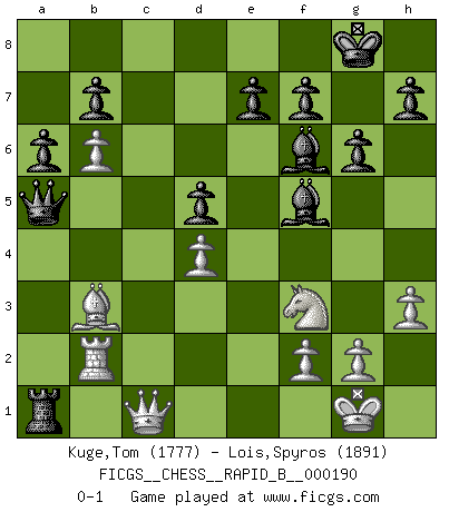 Last move : 0-1 2011 December 18 20:54:21 [Event "FICGS__CHESS__RAPID_B__000190"] [Site "FICGS"] [Date "2011.12.01"] [Round "1"] [White "Kuge,Tom"] [Black "Lois,Spyros"] [Result "0-1"] [WhiteElo "1777"] [BlackElo "1891"] 1.e4 c5 2.a3 g6 3.b4 Bg7 4.Nc3 Nc6 5.b5 Nd4 6.Bc4 Nf6 7.Nf3 O-O 8.O-O Nxe4 9.Bb2 Nxc3 10.Bxc3 d5 11.Ba2 Bg4 12.Bxd4 Bxd4 13.c3 Bf6 14.h3 Be6 15.d4 Qa5 16.Qb3 a6 17.b6 Rac8 18.Rab1 cxd4 19.cxd4 Rc3 20.Qb2 Rxa3 21.Bb3 Rc8 22.Rfc1 Rxc1+ 23.Qxc1 Bf5 24.Rb2 Ra1 0-1 Sicilian defense Kingside Castling by player Black (move 7) Kingside Castling by player White (move 8) Player Black won this chess game. Follow this game move after move (download)Via the squares on the chessboard, the Indians explain the movement of time and the age, the higher influences which control the world and the ties which link Chess with the human soul. (Al-Masudi) Ich hatte Zahnschmerzen im ersten Spiel. In der zweiten Partie tat mir der Kopf weh. In der dritten war es eine Rheuma-Attacke und während der vierten fühlte ich mich nicht gut. Und in der fünften? Nun, man muss doch nicht jedes Spiel gewinnen, oder? (Savielly Grigorievitsch Tartakower) Cuando tu casa esta en llamas, no puedes ser molestado por tus vecinos. O, como decinos en Ajedrez, si tu Rey esta bajo ataque, no te preocupa perder un Peón del lado de la Reina. (Gary Kasparov) Les sacrifices démontrent seulement que quelqu'un a gaffé. (Savielly Tartacover) Lottery : A tax on people who are bad at math. (Author unknown)
