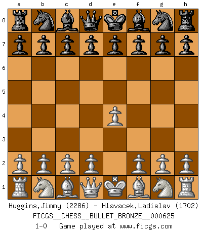 Last move : 1-0 2011 December 3 15:20:48 [Event "FICGS__CHESS__BULLET_BRONZE__000625"] [Site "FICGS"] [Date "2011.12.03"] [Round "1"] [White "Huggins,Jimmy"] [Black "Hlavacek,Ladislav"] [Result "1-0"] [WhiteElo "2286"] [BlackElo "1702"] 1.e4 1-0 This chess game has been lost on time (started : 2011.12.03 14:30:28) King's pawn Opening Player White won this chess game. Follow this game move after move (download)Fischer wanted to give the Russians a taste of their own medicine. (Larry Evans) In der Schule lernt man nichts. Es ist nur Zeitverschwendung. (Robert James Fischer) Algunos sacrificios son sólidos, los demás son míos. (Mikhail Tal) Les échecs sont utiles à l'exercice de la faculté de penser et à celle de l'imagination. Car nous devons posséder une méthode élaborée pour atteindre des buts partout où nous devons conduire notre raison. (Leibnitz) There are more things in heaven and earth than practically anywhere else. (Unknown)