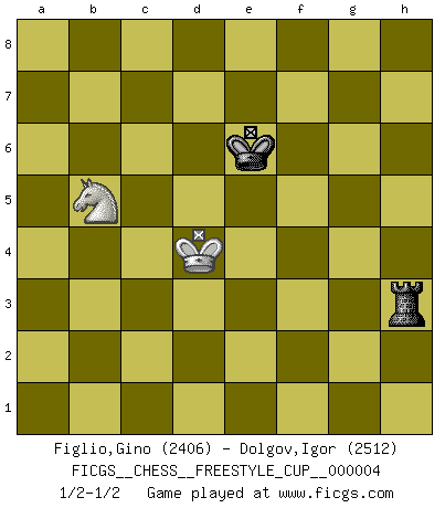 Last move : 1/2-1/2 2011 December 3 16:31:54 [Event "FICGS__CHESS__FREESTYLE_CUP__000004"] [Site "FICGS"] [Date "2011.12.03"] [Round "1"] [White "Figlio,Gino"] [Black "Dolgov,Igor"] [Result "1/2-1/2"] [WhiteElo "2406"] [BlackElo "2512"] 1.d4 d5 2.c4 c6 3.Nf3 Nf6 4.Nc3 dxc4 5.a4 Bf5 6.Ne5 Nbd7 7.Nxc4 Qc7 8.g3 e5 9.dxe5 Nxe5 10.Bf4 Nfd7 11.Bg2 g5 12.Bxe5 Nxe5 13.Qd4 f6 14.O-O-O Be7 15.Ne3 Be6 16.Qe4 Bb3 17.Rd2 O-O 18.h4 Bc5 19.hxg5 fxg5 20.Bh3 Rf7 21.Nf5 Kh8 22.f4 gxf4 23.gxf4 Nc4 24.Rd3 Raf8 25.e3 Bxe3+ 26.Nxe3 Rxf4 27.Qg2 Ne5 28.Rd2 Rf2 29.Rxf2 Rxf2 30.Qg5 Nd3+ 31.Kb1 Rxb2+ 32.Ka1 Qd6 33.Qg7+ Kxg7 34.Nf5+ Kf6 35.Nxd6 Rc2 36.Rb1 Ke5 37.Rxb3 Nc5 38.Kb1 Rh2 39.Rb4 Rxh3 40.Nf7+ Kf6 41.Rf4+ Ke7 42.Nd1 Rh1 43.Kc2 Rh2+ 44.Kb1 Nxa4 45.Rxa4 Kxf7 46.Rxa7 h5 47.Rxb7+ Kf6 48.Rc7 h4 49.Rxc6+ Kg5 50.Ne3 h3 51.Kc1 Ra2 52.Rc5+ Kf4 53.Nd1 h2 54.Rh5 Rg2 55.Rh8 Kf3 56.Rf8+ Ke4 57.Rh8 Kf3 58.Rh7 Ke4 59.Nc3+ Kf3 60.Rh3+ Kg4 61.Rh6 Rg1+ 62.Kd2 h1Q 63.Rxh1 Rxh1 64.Ke3 Rh3+ 65.Kd4 Kf5 66.Nb5 Ke6 1/2-1/2 Comment by player 2 : Igor Dolgov : Thx for the game, Gino Gino Figlio Thanks Igor, good job keeping the draw with such a big time disadvantage QGD Slav : Krause attack Queenside Castling by player White (move 14) Kingside Castling by player Black (move 17) 10 pieces endgame at move 45 : White KRNN , Black KRPPPP WHITE : King + 1 Rook 2 Knights BLACK : King + 1 Rook 4 Pawns 9 pieces endgame at move 45 : White KRN , Black KRPPPP WHITE : King + 1 Rook 1 Knight BLACK : King + 1 Rook 4 Pawns 8 pieces endgame at move 46 : White KRN , Black KRPPP WHITE : King + 1 Rook 1 Knight BLACK : King + 1 Rook 3 Pawns 7 pieces endgame at move 47 : White KRN , Black KRPP WHITE : King + 1 Rook 1 Knight BLACK : King + 1 Rook 2 Pawns 6 pieces endgame at move 49 : White KRN , Black KRP WHITE : King + 1 Rook 1 Knight BLACK : King + 1 Rook 1 Pawn Promotion Queen by player Black (move 62) 5 pieces endgame at move 63 : White KRN , Black KR WHITE : King + 1 Rook 1 Knight BLACK : King + 1 Rook 4 pieces endgame at move 63 : White KN , Black KR WHITE : King + 1 Knight BLACK : King + 1 Rook This chess game ended in a draw. Follow this game move after move (download)You know, comrade Pachman, I don't enjoy being a Minister, I would rather play Chess like you. (Che Guevara) Wie, soll nun auch die Opposition abgeschafft werden? Ja, es tut mir leid, Ihnen diesen Schmerz nicht ersparen zu können. (Aaron Nimzowitsch) Me siento como si fuera una pieza en una partida de Ajedrez, cuando mi oponente me indica: esa pieza no puede ser movida. (Soren Kierkegaard) Des idées, des idées, j'en ai cent, j'en ai mille. Des bonnes, des mauvaises, applicables, irréalisables... Il suffit de faire le tri ! (Roos) I live to kill Traxler counterattack. (Ilmars Cirulis)