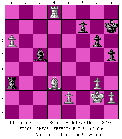 Last move : 1-0 2011 December 3 15:52:59 [Event "FICGS__CHESS__FREESTYLE_CUP__000004"] [Site "FICGS"] [Date "2011.12.03"] [Round "1"] [White "Nichols,Scott"] [Black "Eldridge,Mark"] [Result "1-0"] [WhiteElo "2324"] [BlackElo "2232"] 1.Nf3 Nf6 2.g3 d5 3.Bg2 c5 4.O-O Nc6 5.d4 cxd4 6.Nxd4 e5 7.Nxc6 bxc6 8.c4 Rb8 9.Bg5 Be7 10.Bxf6 Bxf6 11.cxd5 cxd5 12.Bxd5 Rxb2 13.Qa4+ Bd7 14.Qxa7 e4 15.Na3 O-O 16.Rfd1 Qe7 17.Rab1 e3 18.Rxb2 Bxb2 19.Nc4 exf2+ 20.Kxf2 Bf6 21.a4 Rd8 22.a5 Qf8 23.Ne3 Be7 24.Bf3 Bc5 25.Qc7 Qe7 26.Rd3 h5 27.a6 Re8 28.Qxd7 Qxd7 29.Rxd7 Rxe3 30.Kg2 Ra3 31.Rd8+ Kh7 32.Be4+ g6 33.Bd3 1-0 Reti Opening Kingside Castling by player White (move 4) Kingside Castling by player Black (move 15) Player White won this chess game. Follow this game move after move (download)If a ruler does not understand Chess, how can he rule over a kingdom ? (King Khusros II) Ein Remis kann durch Wiederholung von drei Zügen oder durch einen schlechte Zug erreicht werden. (Savielly Grigorievitsch Tartakower) Bendita sea la memoria de aquel que dio al mundo este juego inmortal. (A. G. Gardiner) D'abord les bases : Jouez et étudiez, puis étudiez et jouez, ensuite jouez et étudiez, puis étudiez et jouez. Deuxièmement : Donnez toujours le meilleur de vous-même ! (Ken Smith) Political correctness is subjecting us to gross incompetence. (Johann Piek)