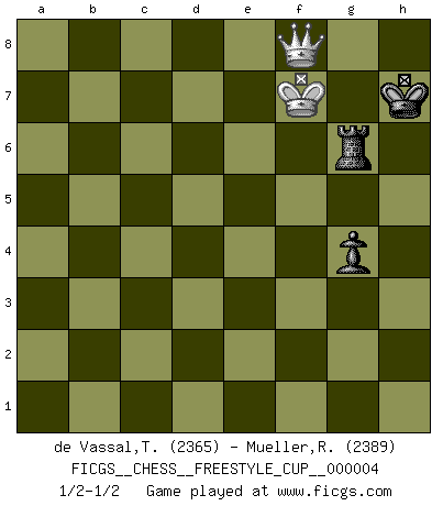 Last move : 1/2-1/2 2011 December 3 16:56:21 [Event "FICGS__CHESS__FREESTYLE_CUP__000004"] [Site "FICGS"] [Date "2011.12.03"] [Round "1"] [White "de Vassal,Thibault"] [Black "Mueller,Robert"] [Result "1/2-1/2"] [WhiteElo "2365"] [BlackElo "2389"] 1.e4 c5 2.Nf3 e6 3.d4 cxd4 4.Nxd4 Nc6 5.Nc3 Qc7 6.Be2 a6 7.O-O Nf6 8.Be3 Bb4 9.Na4 Be7 10.c4 Nxe4 11.c5 O-O 12.Nb6 Rb8 13.Rc1 Rd8 14.Qc2 Nf6 15.Rfd1 d5 16.cxd6 Bxd6 17.Bf3 Nxd4 18.Rxd4 Qxb6 19.Rcd1 Ra8 20.g4 e5 21.Rxd6 Qxd6 22.Rxd6 Rxd6 23.Qc7 Ne8 24.Qe7 Bxg4 25.Bxg4 Rg6 26.Qxb7 Rxg4+ 27.Kf1 Rd8 28.Qxa6 Nc7 29.Qa5 Ne6 30.Qxe5 Ra4 31.a3 h6 32.Qb5 Rda8 33.Bc1 Rd4 34.Be3 Rda4 35.Bc1 R4a5 36.Qb7 R5a7 37.Qe4 Rd8 38.Be3 R7a8 39.h4 Rab8 40.b4 Ra8 41.Bc1 Ra7 42.Kg2 Rb8 43.Bb2 h5 44.Kf1 Rb6 45.Qd5 Rb8 46.Qxh5 Rd8 47.Qf3 Rad7 48.a4 Rd1+ 49.Kg2 Rb1 50.Qc3 Rd3 51.Qc8+ Rd8 52.Qc2 Re1 53.Qc4 Rd2 54.Bc1 Rd4 55.Qc8+ Rd8 56.Qc6 Nd4 57.Qb6 Rd7 58.Qb8+ Kh7 59.Qc8 Rd6 60.b5 Rg6+ 61.Bg5 Re4 62.Kf1 Rge6 63.Be3 Nf5 64.a5 Nxe3+ 65.fxe3 Rxe3 66.Qc2+ g6 67.b6 Rf3+ 68.Kg2 Rf4 69.Qc7 Re2+ 70.Kg3 Rf5 71.Qc4 R5f2 72.Qd4 Rg2+ 73.Kf3 Rd2 74.Qc4 Rgf2+ 75.Ke3 Rc2 76.Qa6 Rb2 77.b7 Rh2 78.Qa7 Rh3+ 79.Ke4 Rxh4+ 80.Kd5 Rh1 81.a6 Rd1+ 82.Kc6 Rc1+ 83.Kd6 Rd1+ 84.Ke5 Ra1 85.Kd4 Rd1+ 86.Kc4 Rd6 87.Kc5 Rf6 88.Qa8 Rc2+ 89.Kd5 Rd2+ 90.Kc4 Rc6+ 91.Kb5 Rc1 92.Kb6 Rd6+ 93.Ka7 R1c6 94.b8Q Rxa6+ 95.Kb7 Rab6+ 96.Kc7 Rxb8 97.Qxb8 Re6 98.Qf8 Rf6 99.Kd7 g5 100.Ke7 Rg6 101.Kxf7 g4 1/2-1/2 Sicilian : Taimanov (Bastrikov) variation Kingside Castling by player White (move 7) Kingside Castling by player Black (move 11) 10 pieces endgame at move 65 : White KQPPP , Black KRRPP WHITE : King + 1 Queen 3 Pawns BLACK : King + 2 Rooks 2 Pawns 9 pieces endgame at move 79 : White KQPP , Black KRRPP WHITE : King + 1 Queen 2 Pawns BLACK : King + 2 Rooks 2 Pawns Promotion Queen by player White (move 94) 8 pieces endgame at move 94 : White KQQ , Black KRRPP WHITE : King + 2 Queens BLACK : King + 2 Rooks 2 Pawns 7 pieces endgame at move 96 : White KQ , Black KRRPP WHITE : King + 1 Queen BLACK : King + 2 Rooks 2 Pawns 6 pieces endgame at move 97 : White KQ , Black KRPP WHITE : King + 1 Queen BLACK : King + 1 Rook 2 Pawns 5 pieces endgame at move 101 : White KQ , Black KRP WHITE : King + 1 Queen BLACK : King + 1 Rook 1 Pawn This chess game ended in a draw. Follow this game move after move (download)I believe that Chess possesses a magic that is also a help in advanced age. A rheumatic knee is forgotten during a game of Chess and other events can seem quite unimportant in comparison with a catastrophe on the chessboard. (Vlastimil Hort) Je mehr wir mit Computern analysieren, desto mehr glauben wir an Verteidigung. (Vladimir Kramnik) Los problemas de Ajedrez exigen del compositor las mismas virtudes que caracterizan todo el arte de valor: originalidad, invención, concisión, armonía, complejidad e insinceridad explendida. (Vladimir Nabokov) C'est la seule position que je connaisse où les deux camps sont mals. Propos prêtés à V. Anand. Success without honor is an unseasoned dish; it will satisfy your hunger, but it won't taste good. (Joe Paterno)