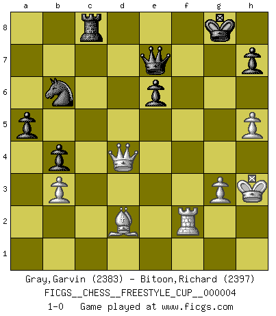 Last move : 1-0 2011 December 3 18:20:1 [Event "FICGS__CHESS__FREESTYLE_CUP__000004"] [Site "FICGS"] [Date "2011.12.03"] [Round "1"] [White "Gray,Garvin"] [Black "Bitoon,Richard"] [Result "1-0"] [WhiteElo "2383"] [BlackElo "2397"] 1.d4 d5 2.c4 e6 3.Nf3 Nf6 4.g3 Be7 5.Bg2 O-O 6.O-O dxc4 7.Qc2 b5 8.a4 b4 9.Nbd2 Bb7 10.Rd1 Qc8 11.Nxc4 Be4 12.Qb3 c5 13.Bf4 Bd5 14.dxc5 Bxc5 15.Nfe5 Nc6 16.Rac1 Rd8 17.Bxd5 Nxd5 18.Nd6 Na5 19.Qf3 Rxd6 20.Be3 Qb7 21.Rxc5 Nc6 22.Bf4 Nxe5 23.Bxe5 Rc6 24.Rb5 Rb6 25.Qg4 f5 26.Qd4 Rxb5 27.axb5 Qxb5 28.e4 fxe4 29.Bxg7 e3 30.Rf1 exf2+ 31.Rxf2 Qd7 32.Bh6 Re8 33.Qg4+ Kh8 34.Qh5 Kg8 35.Qg5+ Kh8 36.Qe5+ Kg8 37.b3 Qe7 38.h4 a6 39.Kh2 a5 40.h5 Rc8 41.Bg5 Qe8 42.Bd2 Qe7 43.Kh3 Nb6 44.Qd4 1-0 Queen's gambit declined Kingside Castling by player Black (move 5) Kingside Castling by player White (move 6) Player White won this chess game. Follow this game move after move (download)Fischer is completely natural. He plays no roles. He's like a child. Very, very simple. (Zita Rajcsanyi) Heutzutage gewinnt im Turnier nicht derjenige Spieler, der weitreichende Pläne entwirft, sondern einfach jener, der Zug um Zug kämpft. (David Bronstein) Fischer no está bajo la obligación de nadie. (Joseph Platz) Les échecs, c'est la lutte contre l'erreur. (Johannes Zukertort) Your best chance to get a Royal Flush in a casino is in the bathroom. (Anonymous)
