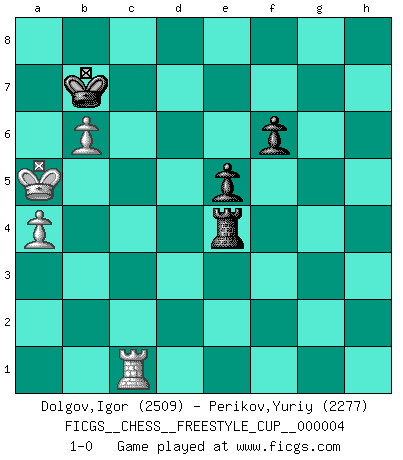 Last move : 1-0 2011 December 3 18:43:40 [Event "FICGS__CHESS__FREESTYLE_CUP__000004"] [Site "FICGS"] [Date "2011.12.03"] [Round "1"] [White "Dolgov,Igor"] [Black "Perikov,Yuriy"] [Result "1-0"] [WhiteElo "2509"] [BlackElo "2277"] 1.e4 c5 2.Nf3 d6 3.d4 cxd4 4.Nxd4 Nf6 5.Nc3 a6 6.Be3 e5 7.Nb3 Be6 8.Qd2 Nbd7 9.f3 Be7 10.g4 h6 11.O-O-O b5 12.h4 Nb6 13.Qf2 Nfd7 14.Kb1 Nc4 15.Bxc4 bxc4 16.Nc1 Rb8 17.N1e2 Qa5 18.Ka1 h5 19.gxh5 Rxh5 20.f4 Nf6 21.f5 Bd7 22.Bc1 Qc5 23.Qf3 Bc6 24.Ng3 Rh7 25.h5 Qb6 26.Qe2 Qb4 27.a3 Qb6 28.Qxc4 a5 29.Kb1 Qc5 30.Qxc5 dxc5 31.Bg5 Rd8 32.Rxd8+ Kxd8 33.Bxf6 Bxf6 34.Nd5 Bg5 35.Rd1 Ke8 36.f6 Bxf6 37.Nxf6+ gxf6 38.Rd6 Bd7 39.Rxf6 Rg7 40.Rf3 Ke7 41.Rc3 c4 42.Rf3 Rg8 43.Kc1 Be6 44.Nf5+ Bxf5 45.Rxf5 Rg1+ 46.Kd2 Ke6 47.Rf3 Rh1 48.Kc3 Rh4 49.a4 Rxh5 50.Kxc4 Rh4 51.Kd3 Rh2 52.Rf1 f6 53.b3 Rg2 54.c3 Ra2 55.Kc4 Rc2 56.Kb5 Rxc3 57.Rb1 Kd7 58.Kxa5 Re3 59.b4 Kc8 60.b5 Rxe4 61.b6 Kb7 62.Rc1 1-0 Sicilian : Najdorf, Byrne (English) attack Queenside Castling by player White (move 11) 10 pieces endgame at move 56 : White KRPPP , Black KRPPP WHITE : King + 1 Rook 3 Pawns BLACK : King + 1 Rook 3 Pawns 9 pieces endgame at move 58 : White KRPPP , Black KRPP WHITE : King + 1 Rook 3 Pawns BLACK : King + 1 Rook 2 Pawns 8 pieces endgame at move 60 : White KRPP , Black KRPP WHITE : King + 1 Rook 2 Pawns BLACK : King + 1 Rook 2 Pawns Player White won this chess game. Follow this game move after move (download)A good player is always lucky. (Jose Raul Capablanca) Drei Punkte vor allen anderen ist wie einer, der im weißen Anzug posiert, während der Rest in Müllsäcke gekleidet dasteht. (Viktor Kortschnoi) Siempre es mejor sacrificar los hombres de tu oponente. (Savielly Tartakower) Pour moi, les échecs ne sont pas un jeu mais un art. (Alexandre Alekhine) Don't be discouraged. It's often the last key in the bunch that opens the lock. (Author unknown)