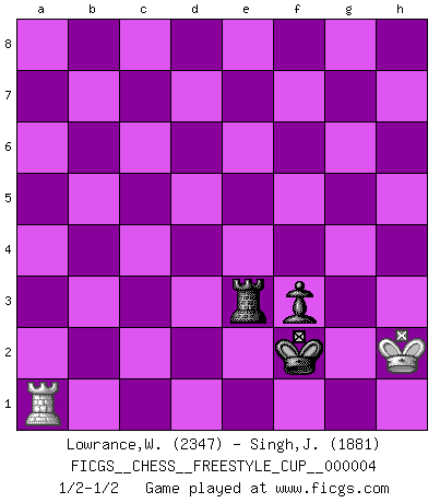 Last move : 1/2-1/2 2011 December 3 19:16:25 [Event "FICGS__CHESS__FREESTYLE_CUP__000004"] [Site "FICGS"] [Date "2011.12.03"] [Round "1"] [White "Lowrance,Wayne"] [Black "Singh,Jai Prakash"] [Result "1/2-1/2"] [WhiteElo "2347"] [BlackElo "1881"] 1.e4 c5 2.Nf3 d6 3.d4 cxd4 4.Nxd4 Nf6 5.Nc3 a6 6.h3 e6 7.Be3 Nc6 8.Bd3 Bd7 9.a3 Rc8 10.O-O Be7 11.f4 Qc7 12.Nf3 O-O 13.Qd2 h6 14.Qf2 b5 15.Rfd1 Rb8 16.Kh1 Rb7 17.Rac1 Rd8 18.Nd2 R7b8 19.Be2 Bc8 20.Bf3 Nd7 21.Qg3 Kh8 22.Bh5 Rf8 23.Ne2 a5 24.c4 b4 25.axb4 Rxb4 26.b3 Nc5 27.Rb1 Bb7 28.Nc3 Ba6 29.Qf2 Nb8 30.Be2 Nbd7 31.Nb5 Bxb5 32.cxb5 Rd8 33.Rbc1 Qb7 34.Bc4 Rc8 35.Qf3 a4 36.bxa4 Rxa4 37.Be2 Kg8 38.Rc2 Qa8 39.Kh2 Rb4 40.g3 Bf8 41.Rdc1 Qa7 42.Kg2 Ra8 43.Bf2 Qb8 44.Bc4 Rba4 45.Rc3 Qb7 46.R1c2 Qb8 47.Bg1 Qb7 48.Be2 Qb8 49.Bf2 Be7 50.Nc4 Ra2 51.Bd4 R8a4 52.Bg1 Ra8 53.Bf2 Rxc2 54.Rxc2 Qxb5 55.Nxd6 Qb1 56.Rd2 Bxd6 57.e5 Ra2 58.Rxd6 g6 59.Qe3 Qe4+ 60.Qxe4 Nxe4 61.Rxd7 Rxe2 62.Kf3 Rxf2+ 63.Kxe4 g5 64.fxg5 hxg5 65.Rd3 Kg7 66.Kd4 Rh2 67.g4 Rb2 68.Ra3 Kg6 69.Rc3 Rb8 70.Kc4 Ra8 71.Rb3 Kg7 72.Kd4 Ra2 73.Ke4 Ra4+ 74.Ke3 Kg6 75.Rc3 Ra5 76.Kd4 Kg7 77.Rc7 Ra4+ 78.Rc4 Ra3 79.Rc3 Ra2 80.Kd3 Kg6 81.Ke4 Ra1 82.Rd3 Re1+ 83.Kd4 Rh1 84.Ra3 Rd1+ 85.Ke4 Kg7 86.Rb3 Re1+ 87.Kd4 Re2 88.Ra3 Rb2 89.Ke3 Kg6 90.Kd4 Rh2 91.Ke4 Rc2 92.Rb3 Rc4+ 93.Ke3 Rf4 94.Rb8 Rf1 95.Rg8+ Kh7 96.Rxg5 Re1+ 97.Kd4 Rd1+ 98.Kc4 Rc1+ 99.Kb5 Kh6 100.Rh5+ Kg7 101.h4 Rc3 102.g5 Re3 103.Kc4 Rxe5 104.Kd4 Rd5+ 105.Ke4 Ra5 106.Rh6 Ra4+ 107.Kd3 Ra5 108.Rf6 Ra3+ 109.Ke2 Rh3 110.Rf4 e5 111.Rf5 Rxh4 112.Rxe5 Rh3 113.Rf5 Rg3 114.Kf2 Rd3 115.Rf3 Rd5 116.Rg3 Rf5+ 117.Kg1 Kg6 118.Kh1 Rxg5 119.Rf3 Rd5 120.Kg2 f5 121.Kf2 Kf6 122.Ke2 Rd4 123.Re3 Ra4 124.Kf3 Kg5 125.Kf2 Ra2+ 126.Kf3 Rh2 127.Re6 Rh3+ 128.Kg2 Rc3 129.Re7 Kg4 130.Rg7+ Kf4 131.Re7 Rg3+ 132.Kf2 Ra3 133.Ke2 Ra2+ 134.Kf1 Kf3 135.Kg1 f4 136.Rb7 Ra1+ 137.Kh2 Re1 138.Rb6 Kf2 139.Ra6 f3 140.Ra2+ Re2 141.Ra1 Re3 1/2-1/2 Sicilian : Najdorf, Adams attack Kingside Castling by player White (move 10) Kingside Castling by player Black (move 12) 10 pieces endgame at move 64 : White KRPPP , Black KRPPP WHITE : King + 1 Rook 3 Pawns BLACK : King + 1 Rook 3 Pawns 9 pieces endgame at move 96 : White KRPPP , Black KRPP WHITE : King + 1 Rook 3 Pawns BLACK : King + 1 Rook 2 Pawns 8 pieces endgame at move 103 : White KRPP , Black KRPP WHITE : King + 1 Rook 2 Pawns BLACK : King + 1 Rook 2 Pawns 7 pieces endgame at move 111 : White KRP , Black KRPP WHITE : King + 1 Rook 1 Pawn BLACK : King + 1 Rook 2 Pawns 6 pieces endgame at move 112 : White KRP , Black KRP WHITE : King + 1 Rook 1 Pawn BLACK : King + 1 Rook 1 Pawn 5 pieces endgame at move 118 : White KR , Black KRP WHITE : King + 1 Rook BLACK : King + 1 Rook 1 Pawn This chess game ended in a draw. Follow this game move after move (download)Modern Chess is too much concerned with things like Pawn structure. Forget it, Checkmate ends the game. (Nigel Short) Ein bischen Romantik kann weder im Schach noch in der Liebe schaden. Also versuche ich mich ab und zu daran zu erinnern. (Nigel Short) Aquellos que dicen que entienden al Ajedrez, no entienden nada. (Robert Hubner) Ce qui caractérise les parties de combat, c'est que si le défenseur a constamment de difficiles problèmes à résoudre, l'attaquant doit chercher sans relâche de nouvelles possibilités d'attaque. (Koblentz) The large trees attract high winds. (Chinese proverb)