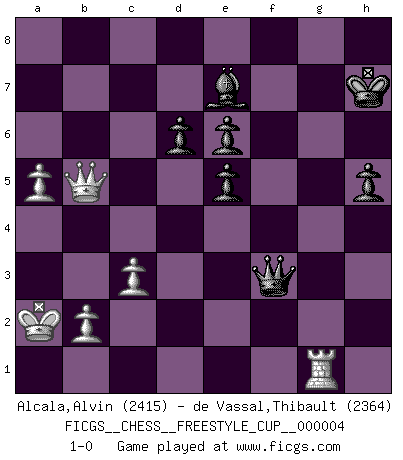 Last move : 1-0 2011 December 3 18:40:47 [Event "FICGS__CHESS__FREESTYLE_CUP__000004"] [Site "FICGS"] [Date "2011.12.03"] [Round "1"] [White "Alcala,Alvin"] [Black "de Vassal,Thibault"] [Result "1-0"] [WhiteElo "2415"] [BlackElo "2364"] 1.e4 c5 2.Nf3 d6 3.d4 cxd4 4.Nxd4 Nf6 5.Nc3 a6 6.f3 e5 7.Nb3 Be6 8.Be3 Be7 9.Qd2 O-O 10.O-O-O Nbd7 11.a3 b5 12.g4 Nb6 13.g5 Nfd7 14.Na5 Qc7 15.h4 Nc5 16.Nd5 Bxd5 17.exd5 Nxd5 18.Qxd5 Qxa5 19.f4 Qc7 20.f5 Rac8 21.f6 gxf6 22.gxf6 Bxf6 23.Bh3 Ne6 24.c3 Qe7 25.Bh6 Rfd8 26.Rdf1 Rb8 27.Bxe6 fxe6 28.Qf3 Rf8 29.Bxf8 Rxf8 30.Qc6 Rb8 31.Kb1 Bg7 32.Rh2 Rf8 33.Rxf8+ Bxf8 34.Qxa6 Qe8 35.Rg2+ Kh8 36.Qb7 h5 37.Qe4 Qf7 38.Ka2 Be7 39.Qc6 Kh7 40.Qxb5 Bxh4 41.a4 Be7 42.a5 Qf3 43.Rg1 1-0 Sicilian : Najdorf Kingside Castling by player Black (move 9) Queenside Castling by player White (move 10) Player White won this chess game. Follow this game move after move (download)Becoming successful at Chess allows you to discover your own personality. That's what I want for the kids I teach. (Saudin Robovic) Intelligenz läßt sich nicht am Weg, sondern nur am Ergebnis feststellen. (Garry Kasparov) ¡Examina movidas que hagan daño! Un buen ojo for movidas desvastantes es mucho mas importante que el conocimiento de principios estratégicos. (Purdy) Si rien de grave n'est détecté lors de l'analyse d'une position, on joue alors le coup. Seconde règle de Blumenfeld. We cannot be sure of having something to live for unless we are willing to die for it. (Ernesto Che Guevara)