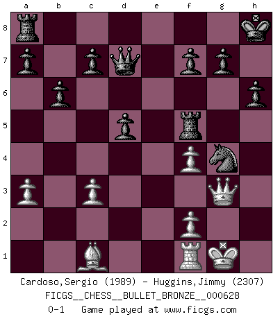 Last move : 0-1 2011 December 3 19:0:1 [Event "FICGS__CHESS__BULLET_BRONZE__000628"] [Site "FICGS"] [Date "2011.12.03"] [Round "1"] [White "Cardoso,Sergio"] [Black "Huggins,Jimmy"] [Result "0-1"] [WhiteElo "1989"] [BlackElo "2307"] 1.c4 e5 2.Nf3 e4 3.Nd4 Nc6 4.e3 Nf6 5.Nc3 Bc5 6.Nb3 Bb4 7.a3 Bxc3 8.bxc3 Ne5 9.d4 exd3 10.Bxd3 d5 11.c5 O-O 12.O-O Re8 13.Nd4 Qe7 14.Bf5 Bxf5 15.Nxf5 Qxc5 16.Qd4 Qc4 17.Rb1 b6 18.Rb4 Qc6 19.Qh4 Qd7 20.Qg5 Ng6 21.h4 Re5 22.Rf4 Kh8 23.h5 h6 24.Qg3 Nxh5 25.Qf3 Nhxf4 26.exf4 Rxf5 27.g4 Ne5 28.Qg3 Nxg4 0-1 English, Nimzovich, Flohr variation Kingside Castling by player Black (move 11) Kingside Castling by player White (move 12) Player Black won this chess game. Follow this game move after move (download)What would Chess be without silly mistakes ? (Kurt Richter) Die meiste Zeit treffe ich auf Gegner, die meine Enkel sein könnten. Ich bin da, um ihnen zu zeigen, dass sie von mir noch einiges lernen können. (Viktor Kortschnoi) Vive, pierde y aprende al observar a tu oponente como ganar. (Amber Steenbock) Le joueur d'Echecs qui veut atteindre le top est obligé de développer son propre credo créatif. Alexeï Stepanovicth Souétine. Il est facile d'écrire des livres ! Ce qui est difficile, c'est de jouer ! (Alexeï Stepanovicth Souétine) The only difference between a tax man and a taxidermist is that the taxidermist leaves the skin. (Mark Twain)