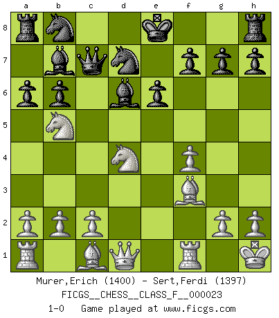 Last move : 1-0 2007 January 15 21:49:24 [Event "FICGS__CHESS__CLASS_F__000023"] [Site "FICGS"] [Date "2007.01.08"] [Round "1"] [White "Murer,Erich"] [Black "Sert,Ferdi"] [Result "1-0"] [WhiteElo "1400"] [BlackElo "1397"] 1.e4 c5 2.Nf3 d6 3.d4 cxd4 4.Nxd4 Nf6 5.Nc3 a6 6.Be2 e6 7.O-O Qc7 8.f4 Be7 9.Kh1 b6 10.Bf3 Bb7 11.e5 Nfd7 12.exd6 Bxd6 13.Ncb5 1-0 Sicilian : Najdorf, Opovcensky variation Kingside Castling by player White (move 7) Player White won this chess game. Follow this game move after move (download)There are two classes of men; those who are content to yield to circumstances and who play whist; those who aim to control circumstances, and who play Chess. (Mortimer Collins) Oft bringt ein stiller Zug das Erdbeben. (Richard Reti) Todo se encuentra en un estado de flujo y esto incluye al mundo del Ajedrez. (Mikhail Botvinnik) Je ne suis pas le dernier à jouer lâchement des coups douteux pendant le zeïtnot de l'adversaire pour l'achever: en effet les coups qui font le plus peur sont ceux que l'on ne comprend pas. Je me fais souvent peur quand je joue. (Un professeur anonyme) Life is like a ten-speed bicycle: most of us have gears we never use. (Charles M. Schulz)