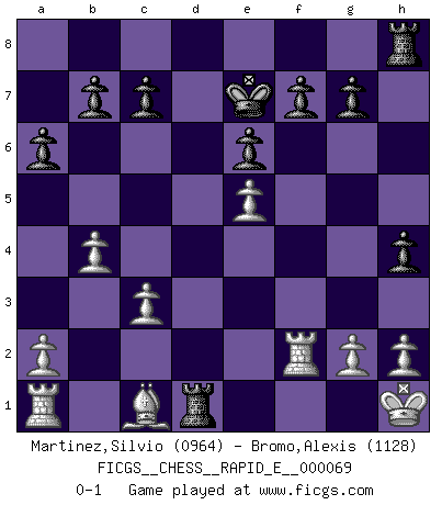Last move : 0-1 2012 January 5 1:28:22 [Event "FICGS__CHESS__RAPID_E__000069"] [Site "FICGS"] [Date "2011.12.04"] [Round "1"] [White "Martinez,Silvio"] [Black "Bromo,Alexis"] [Result "0-1"] [WhiteElo "0964"] [BlackElo "1128"] 1.Nf3 d5 2.d4 Nc6 3.Nc3 Nf6 4.e4 e6 5.Bb5 Bd7 6.O-O a6 7.Bxc6 Bxc6 8.e5 Ne4 9.Nxe4 dxe4 10.Nd2 Qxd4 11.Re1 Bc5 12.Kh1 Qxf2 13.Nxe4 Bxe4 14.Rxe4 Rd8 15.Qe1 Qxe1+ 16.Rxe1 Ke7 17.c3 h5 18.b4 Bf2 19.Rf1 h4 20.Rxf2 Rd1+ 0-1 Reti Opening Kingside Castling by player White (move 6) Player Black won this chess game. Follow this game move after move (download)In blitz, the Knight is stronger than the Bishop. (Vlastimil Hort) Wer sich die Fähigkeit anerziehen will im Schach selbstständig zu denken, der muß alles meiden, was leblos ist: ausgeklügelte Theorien, die sich auf sehr wenige Beispiele und eine Menge Hirngespinste stützen. (Emanuel Lasker) No existe un remordimiento como el remordimiento del Ajedrez. (H. G. Wells) La solitude du joueur d'Echecs à l'approche du mat est semblable à celle du condamné. (Francis Szpiner) O divine art of subtlety and secrecy! Through you we learn to be invisible, through you inaudible and hence we can hold the enemy's fate in our hands. (Sun Tzu)