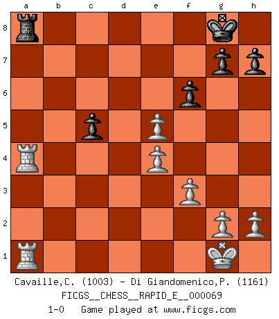 Last move : 1-0 2011 December 29 8:49:37 [Event "FICGS__CHESS__RAPID_E__000069"] [Site "FICGS"] [Date "2011.12.04"] [Round "1"] [White "Cavaille,Cedric"] [Black "Di Giandomenico,Pierino"] [Result "1-0"] [WhiteElo "1003"] [BlackElo "1161"] 1.e4 e5 2.Nf3 Nf6 3.Nxe5 Bd6 4.Nf3 O-O 5.Nc3 Nc6 6.Bc4 Qe8 7.d3 Bb4 8.Bd2 d6 9.a3 Bc5 10.b4 Bb6 11.O-O Ne5 12.Nxe5 Qxe5 13.a4 a5 14.bxa5 Rxa5 15.Qf3 Bd7 16.Ne2 Bg4 17.Qe3 Rfa8 18.Bb3 c6 19.Bxa5 Bxa5 20.f3 Bh5 21.Nf4 d5 22.Nxh5 Nxh5 23.c4 dxc4 24.Bxc4 Nf6 25.d4 Bb6 26.dxe5 Nd7 27.Qxb6 Nxb6 28.Be2 Nxa4 29.Ra3 b5 30.Bd1 c5 31.Bxa4 bxa4 32.Rfa1 f6 33.Rxa4 1-0 Petrov's defense Kingside Castling by player Black (move 4) Kingside Castling by player White (move 11) Player White won this chess game. Follow this game move after move (download)I have never in my life played the French Defence, which is the dullest of all openings. (Wilhelm Steinitz) Es genügt nicht ein guter Spieler zu sein, man muß auch gut spielen. (Siegbert Tarrasch) El Ajedrez tiene tanto misterio como las mujeres. (Purdy) On entre au jeu d'Echecs comme on entre en Religion. Pour le joueur d'Echecs, la partie d'Echecs c'est l'office, la messe, le défilé du 1er Mai, le dépôt de gerbe au Monument aux Morts. C'est un drame sacré. (Michel Roos) As a goal marker shodan is important. As a destination it is a poor place to stop. (Thomas Tamayo)