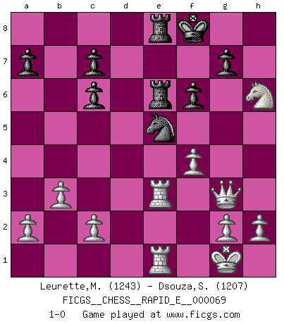 Last move : 1-0 2012 January 6 15:56:37 [Event "FICGS__CHESS__RAPID_E__000069"] [Site "FICGS"] [Date "2011.12.04"] [Round "1"] [White "Leurette,Marc-Antoine"] [Black "Dsouza,Stanislaus"] [Result "1-0"] [WhiteElo "1243"] [BlackElo "1207"] 1.e4 e5 2.Nf3 Bc5 3.Bc4 h6 4.d4 exd4 5.Nxd4 Nf6 6.Nc3 d6 7.Be3 O-O 8.O-O Nc6 9.Nxc6 bxc6 10.Bxc5 dxc5 11.Qf3 Be6 12.Rad1 Qe7 13.Bxe6 Qxe6 14.Rfe1 Rfe8 15.e5 Nd7 16.b3 Rab8 17.Qg3 Nb6 18.Ne4 Nd7 19.Re3 Nxe5 20.Nxc5 Qf6 21.Rde1 Qd6 22.Ne4 f6 23.Nxd6 Re6 24.Nf5 Rbe8 25.Nxh6+ Kf8 26.f4 1-0 King's knight Opening Kingside Castling by player Black (move 7) Kingside Castling by player White (move 8) Player White won this chess game. Follow this game move after move (download)It is always better to sacrifice your opponent's men. (Savielly Tartakower) Ich habe die besten Aussichten, den ersten Preis zu gewinnen - denn jeder muss gegen Steinitz spielen, nur ich nicht! (Wilhelm Steinitz) No soy una persona materialista y por eso, no resiento la falta o pérdida del dinero. La ausencia de cosas mundanas carece de importancia. Ya que el Ajedrez es una forma en la que puedo ser tan materialista como yo desee sin tener la necesidad de vender mi alma. (Jamie Walter Adams) Vous savez, camarade Pachman, je n'éprouve pas de plaisir à être ministre, je jouerais plutôt aux échecs comme vous, ou alors ferais une révolution au Venezuela. (Che Guevara à Ludek Pachman, 'Checkmate in Prague', 1975) Perseverance does not equal worthiness. Next time you want to get my attention, wear something fun. Low-riding jeans are hot. (Gregory House, House M.D.)