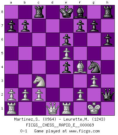 Last move : 0-1 2012 January 2 23:10:42 [Event "FICGS__CHESS__RAPID_E__000069"] [Site "FICGS"] [Date "2011.12.04"] [Round "1"] [White "Martinez,Silvio"] [Black "Leurette,Marc-Antoine"] [Result "0-1"] [WhiteElo "0964"] [BlackElo "1243"] 1.Nf3 d5 2.d4 Nf6 3.Nc3 Bf5 4.g3 Nc6 5.Bg2 h6 6.O-O Qd7 7.Bf4 Bh3 8.Bxh3 Qxh3 9.Bxc7 e6 10.e4 Rc8 11.Bf4 dxe4 12.Ne5 Nxe5 13.dxe5 Ng4 14.Re1 Qxh2+ 0-1 Reti Opening Kingside Castling by player White (move 6) Player Black won this chess game. Follow this game move after move (download)I guess a certain amount of temperament is expected of Chess geniuses. (Ron Gross) Schach verlangt totale Konzentration. (Robert James Fischer) Tu sabes que vas a perder. Aún cuando tenía la ventaja, yo sabía que iba a perder. - al estar jugando con Fischer (Andrew Soltis) Je menace de comprendre la position. (Anonyme) Perhaps chess is the wrong game for the times (The Chess Master and the Computer, by Garry Kasparov - 2010)