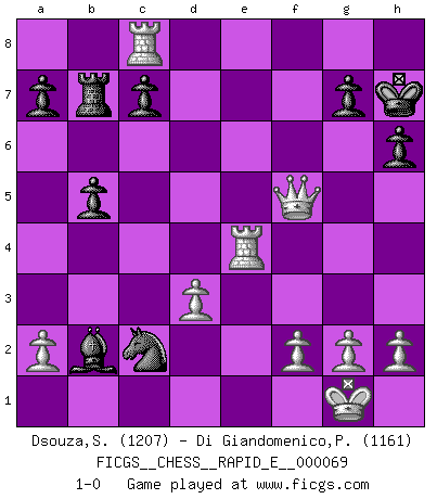Last move : 1-0 2012 January 7 19:25:50 [Event "FICGS__CHESS__RAPID_E__000069"] [Site "FICGS"] [Date "2011.12.04"] [Round "1"] [White "Dsouza,Stanislaus"] [Black "Di Giandomenico,Pierino"] [Result "1-0"] [WhiteElo "1207"] [BlackElo "1161"] 1.e4 e5 2.Nf3 Nf6 3.Nxe5 Nxe4 4.Bc4 Bd6 5.Nxf7 Rf8 6.O-O Rxf7 7.Bxf7+ Kxf7 8.Qh5+ Kg8 9.d3 Nf6 10.Qh3 b5 11.Nc3 Nc6 12.Bg5 Qf8 13.Bxf6 Qxf6 14.Rab1 Be5 15.Ne4 d5 16.Nxf6+ Bxf6 17.Qh5 h6 18.Rbe1 Nd4 19.Re8+ Kh7 20.Qxd5 Rb8 21.Qg8+ Kg6 22.Rxc8 Rb7 23.Re1 Nxc2 24.Re4 Bxb2 25.Qe6+ Kh7 26.Qf5+ 1-0 Petrov : Damiano variation Kingside Castling by player White (move 6) Player White won this chess game. Follow this game move after move (download)A player surprised is half beaten. (Proverb) Kasparov ist eine Art Monster mit hundert Augen, denen auch nicht das Geringste entgeht. (Tony Miles) El poder defensivo de una pieza clavada, solamente es imaginario. (Aaron Nimzovich) La menace est plus forte que l'exécution. (Aaron Nimzovitch) Imagination is more important than knowledge. Knowledge is limited. Imagination encircles the world. (Albert Einstein)