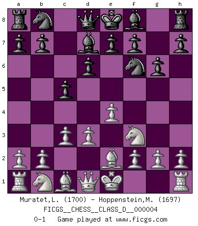 Last move : 0-1 2006 June 25 23:50:25 [Event "FICGS__CHESS__CLASS_D__000004"] [Site "FICGS"] [Date "2006.05.11"] [Round "1"] [White "Muratet,Lucas"] [Black "Hoppenstein,Michael"] [Result "0-1"] [WhiteElo "1700"] [BlackElo "1697"] 1.e4 c5 2.Nf3 d6 3.c3 Nf6 4.Be2 Bd7 5.d3 g6 0-1 This chess game has been lost on time (started : 2006.05.11 8:43:21) Sicilian Player Black won this chess game. Follow this game move after move (download)Morphy was probably the greatest genius of them all. (Bobby Fischer) Das Schachspiel übertrifft alle anderen Spiele so weit wie der Chimborasso einen Misthaufen. (Arthur Schopenhauer) En el Ajedrez, tal como es jugado por los Maestros, practicamente la suerte es eliminada. (Emanuel Lasker) Le jeu d'échecs fait naître et fortifie en nous plusieurs qualités précieuses dans le cours de l'existence, telles que la prévoyance, la circonspection, la prudence, et la persévérance. (Benjamin Franklin - 1783, la morale des échecs) The quality of decision is like the well-timed swoop of a falcon which enables it to strike and destroy its victim. (Sun Tzu)