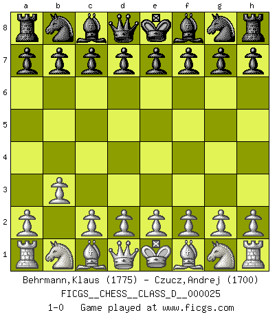 Last move : 1-0 2007 February 19 5:6:55 [Event "FICGS__CHESS__CLASS_D__000025"] [Site "FICGS"] [Date "2007.01.09"] [Round "1"] [White "Behrmann,Klaus"] [Black "Czucz,Andrej"] [Result "1-0"] [WhiteElo "1775"] [BlackElo "1700"] 1.b3 1-0 This chess game has been lost on time (started : 2007.01.09 13:23:42) Nimzovich-Larsen attack Player White won this chess game. Follow this game move after move (download)All that matters on the Chessboard is good moves. (Bobby Fischer) Im Blitz ist es einfacher mit einer Figur weniger anzugreifen, als sich mit einer Mehrfigur zu verteidigen. (Mikhail Nekhemyevich Tal) Si pudieramos observar el interior de la cabeza de un jugador de Ajedrez, encontraríamos ahí un mundo lleno de sentimientos, imágenes, ideas, emoción y pasión. (Alfred Binet) Horreur, mais aussi harmonie suprême : qu'y avait-il en effet au monde en dehors des échecs ? Le brouillard, l'inconnu, le non-être... (Vladimir Nabokov) It's unlucky to be superstitious. (Dave Enteles)