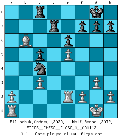 Last move : 0-1 2012 February 15 17:33:52 [Event "FICGS__CHESS__CLASS_A__000112"] [Site "FICGS"] [Date "2011.12.04"] [Round "1"] [White "Pilipchuk,Andrey"] [Black "Wolf,Bernd"] [Result "0-1"] [WhiteElo "2030"] [BlackElo "2072"] 1.d4 Nf6 2.c4 e6 3.Nc3 Bb4 4.Nf3 c5 5.g3 cxd4 6.Nxd4 O-O 7.Bg2 d5 8.cxd5 Nxd5 9.Qb3 Qa5 10.Bd2 Nc6 11.Nxc6 bxc6 12.O-O Bxc3 13.bxc3 Ba6 14.Rfd1 Qc5 15.e4 Bc4 16.Qa4 Nb6 17.Qb4 Qh5 18.Re1 Bd3 19.Be3 Nc4 20.Qc5 Qxc5 21.Bxc5 Rfd8 22.e5 Rac8 23.Bxa7 c5 24.Be4 Bxe4 25.Rxe4 Nd2 26.Re2 Rd7 27.Bb6 Nc4 0-1 Nimzo-Indian : Three knights variation Kingside Castling by player Black (move 6) Kingside Castling by player White (move 12) Player Black won this chess game. Follow this game move after move (download)Live, lose, and learn, by observing your opponent how to win. (Amber Steenbock) Im Wettkampf zwischen starken Meistern kommen Fehler sehr selten vor, deshalb ist es mit bloßem Warten nicht getan. (José Raúl Capablanca) No es suficiente ser un buen jugador, se debe también de jugar bién. (Siegbert Tarrasch) Toute estimation doit être constamment réévaluée. (Jacob Estrin) In theory there is no difference between theory and practice. In practice there is. (Yogi Berra)