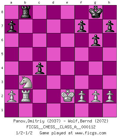 Last move : 1/2-1/2 2012 January 25 10:42:44 [Event "FICGS__CHESS__CLASS_A__000112"] [Site "FICGS"] [Date "2011.12.04"] [Round "1"] [White "Panov,Dmitriy"] [Black "Wolf,Bernd"] [Result "1/2-1/2"] [WhiteElo "2037"] [BlackElo "2072"] 1.e4 c5 2.c3 Nf6 3.e5 Nd5 4.d4 cxd4 5.cxd4 d6 6.Nf3 Nc6 7.Bc4 Nb6 8.Bb5 dxe5 9.Nxe5 Bd7 10.Bxc6 Bxc6 11.Nxc6 bxc6 12.O-O g6 13.Re1 Bg7 14.Bg5 O-O 15.Bxe7 Qxd4 16.Qxd4 Bxd4 17.Nd2 Rfe8 18.Ba3 c5 19.Rxe8+ Rxe8 20.Kf1 Na4 21.Rb1 Rb8 22.Nb3 Bxb2 23.Bxb2 Nxb2 24.Rxb2 c4 25.Ke2 1/2-1/2 Sicilian : Alapin's variation (2.c3) Kingside Castling by player White (move 12) Kingside Castling by player Black (move 14) This chess game ended in a draw. Follow this game move after move (download)Fischer was a master of clarity and a king of artful positioning. His opponents would see where he was going but were powerless to stop him. (Bruce Pandolfini) Ihnen, Herr Lasker, habe ich nur drei Worte zu sagen: Schach und matt. (Siegbert Tarrasch) Tu eres para mi la Reina en d8 y yo soy el Peón en d7!!. (GM Eduard Gufeld) Vous savez, camarade Pachman, je n'éprouve pas de plaisir à être ministre, je jouerais plutôt aux échecs comme vous, ou alors ferais une révolution au Venezuela. (Che Guevara à Ludek Pachman, 'Checkmate in Prague', 1975) When I took office, only high energy physicists had ever heard of what is called the World Wide Web... Now even my cat has its own page. (Bill Clinton, 1996)