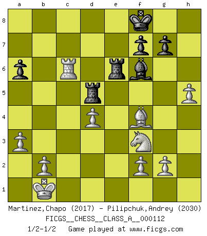 Last move : 1/2-1/2 2012 February 8 20:52:28 [Event "FICGS__CHESS__CLASS_A__000112"] [Site "FICGS"] [Date "2011.12.04"] [Round "1"] [White "Martinez,Chapo"] [Black "Pilipchuk,Andrey"] [Result "1/2-1/2"] [WhiteElo "2017"] [BlackElo "2030"] 1.d4 Nf6 2.c4 e6 3.Nf3 d5 4.Nc3 Be7 5.Bf4 O-O 6.e3 c5 7.dxc5 Bxc5 8.a3 Nc6 9.Qc2 Qa5 10.O-O-O Be7 11.h4 a6 12.Kb1 Rd8 13.cxd5 exd5 14.Bd3 Bg4 15.Ng5 Bxd1 16.Bxh7+ Kf8 17.Rxd1 d4 18.Qb3 Nd5 19.Nxd5 Qxd5 20.Qxd5 Rxd5 21.Be4 Rd7 22.Nf3 Re8 23.h5 R7d8 24.exd4 Bf6 25.Bxc6 bxc6 26.Rc1 Rd5 27.Rxc6 Re6 1/2-1/2 Queen's pawn game Kingside Castling by player Black (move 5) Queenside Castling by player White (move 10) This chess game ended in a draw. Follow this game move after move (download)Openings teach you openings. Endgames teach you chess ! (Stephan Gerzadowicz) Der Knackpunkt bei der Konzentration ist, daß wir nur durch sie etwas Neues und Ungewöhnliches am Schachbrett finden können. Sie ist der einzige Weg durch neue neue Ideen eine Überraschung zu bereiten. (Garry Kasparov) Si tu oponente te ofrece un empate, trata de averiguar porque piensa él que esta en una posición peor. (Nigel Short) Shah mat. Le roi est mort. Cri de fierté d'un joueur venant de terrasser son adversaire, courtoisement, sans effusion de sang. Patience, use the Force, think ! (Obi-Wan Kenobi in Star Wars ep.2)